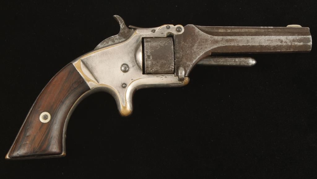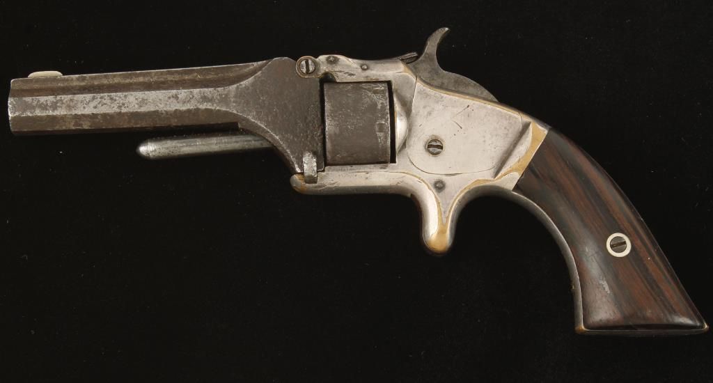 Later model 2nd issue spur trigger 7 shot tip up revolver circa late 1870's to early 1880's with 3-3/16" octagon solid rib barrel. Silver plated brass frame, square butt rosewood grips and fixed sights. Good markings on top of barrel. No markings visible on cylinder and good working action. Condition: Fair to good showing heavy pitting on barrel and cylinder, frame shows 60% finish and grips are good. *Antique Firearm*
