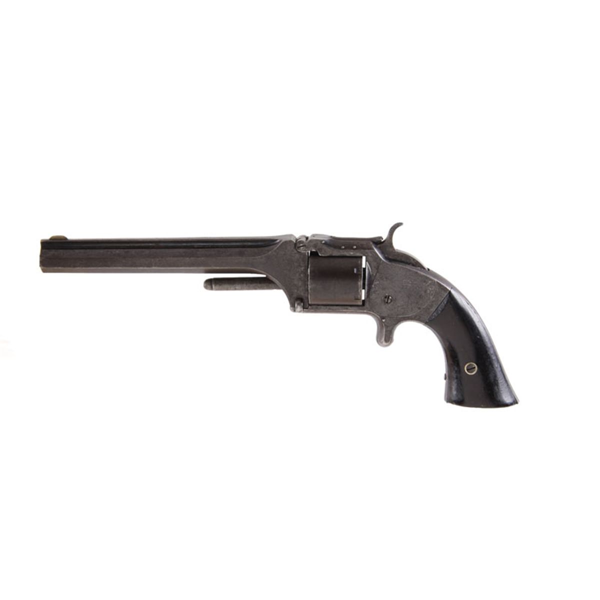 Smith & Wesson Mdl No2 Cal .32RF SN:40882 Civil War Era 6 shot revolver in .32 Rim Fire chambering. Later 3 pin model blued finish, rosewood smooth stocks, 6" octagonal barrel with fixed sights, fair bore that should clean, working action.