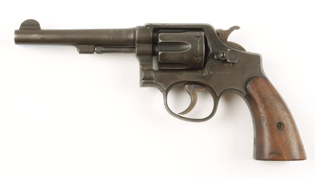 Double action revolver made during WWII with 5" barrel. Parkerized finish, smooth walnut grips, case colored hammer and trigger, fixed sights, and non shrouded ejector rod. Top strapped stamped with U.S. Bomb "US PROPERTY" and "G.H.D." Left side reliever stamped "Cal. .38 special". Missing lanyard ring. Good bore and timing is slightly off. Condition: Fair plus showing pockets of pitting, and probably refinished. Wood is fair to good. *CURIO & RELIC FIREARM*