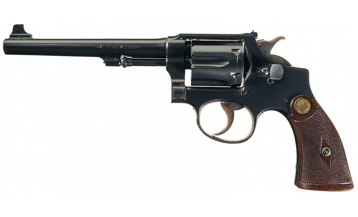 Manufactured circa 1915-1942. Square blade front and adjustable notch rear sights, with the standard markings on the barrel, casehardened hammer and trigger, and checkered grips with Smith & Wesson medallions.
