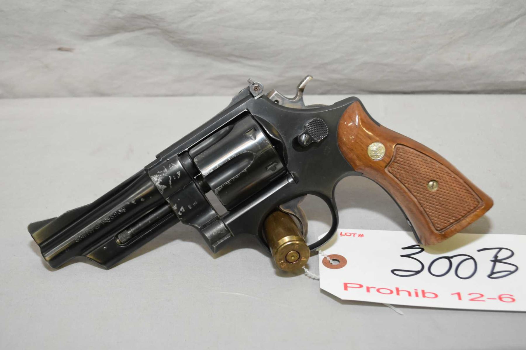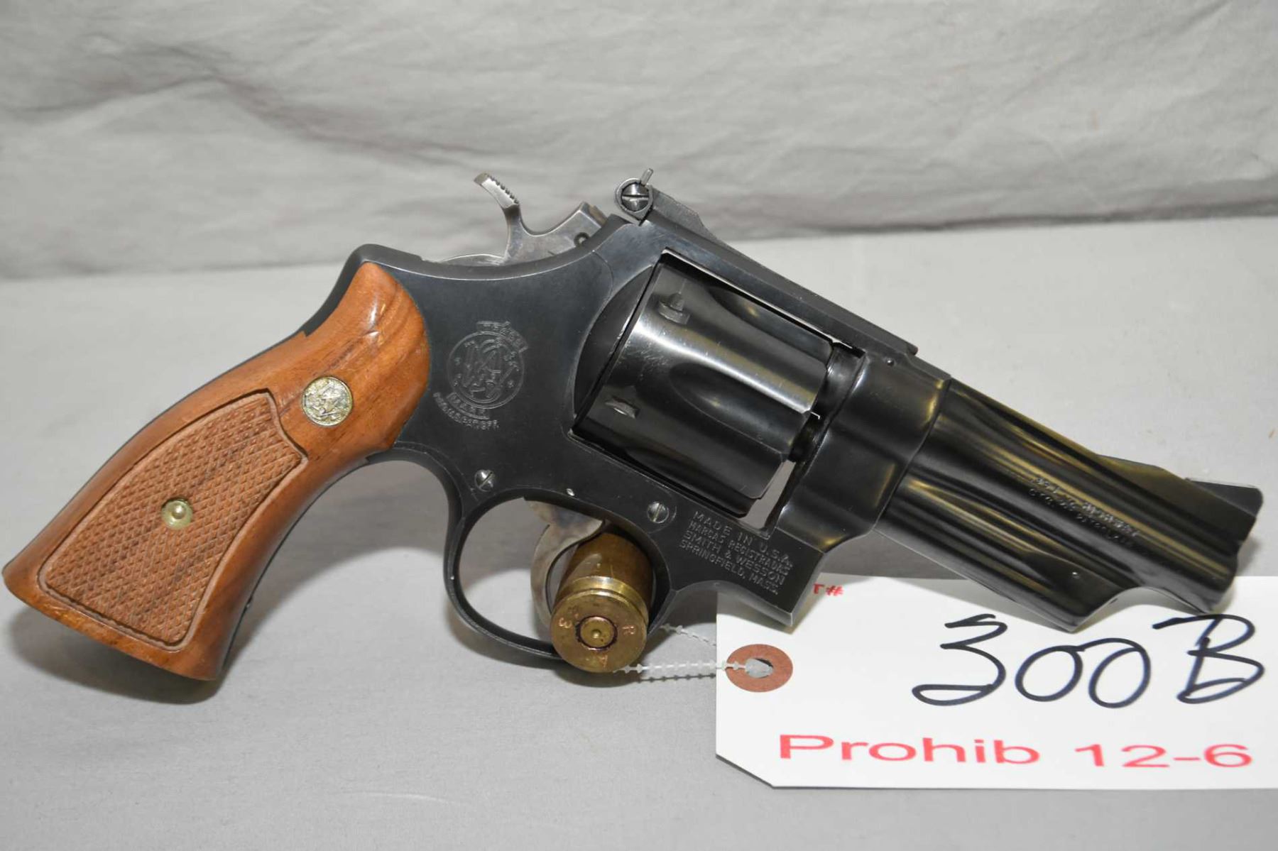 Smith & Wesson Mod 28 - 2 Highway Patrolman .357 Mag 6 Shot Revolver w/ 102 mm bbl [ blued finish, starting to fade in some areas, with some marks, mostly to left side, faint cylinder ring, adjustable rear sight, case colored trigger and hammer, walnut checkered Smith & Wesson insigina grips with some marks ] Ser # N40590 Prohib 12 - 6 Cert # 3867196 FRT # 24940 - 1