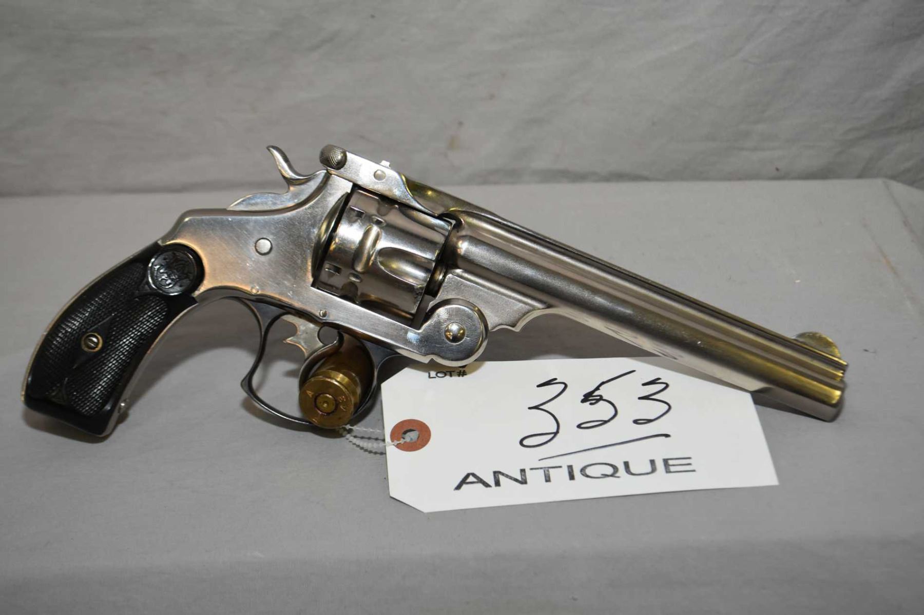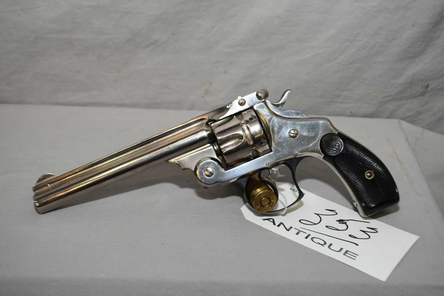 Smith & Wesson Mod 44 Double Action First Model .44 S & W Russian Cal 6 Shot Revolver w/ 6" bbl [ nickel finished, blued trigger guard, hard rubber Smith & Wesson monogramed grips, barrel Patent Dates 1865, 1869, 1871, 1879, 1880, cylinder has two sets of stop notches, and is 1 7/16" long ] Ser # 30957 ANTIQUE NO PAL REQ
