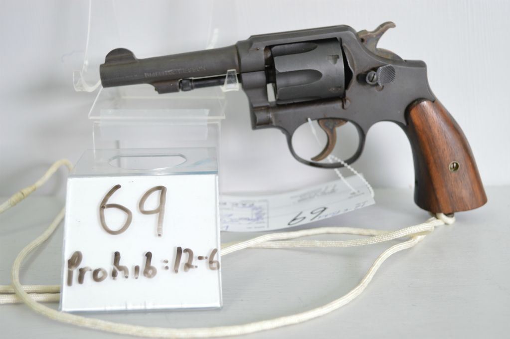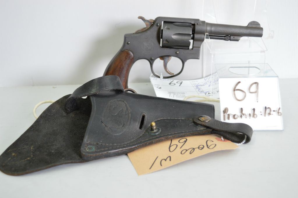 Smith & Wesson Mod Victory .38 Spec cal 6 shot Revolver w/ 102 mm bbl [ flat blued finish, top of frame stamped U.S. Navy, walnut grips, w/white lanyard, & correct U.S.in Oval marked leather holster , also stamped U.S.N. Boyt Dated 43 , this gun was issued to U.S. Navy Pilots ] Ser # V157534 Prohib 12 -6 Cert # TC1