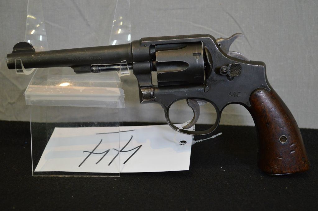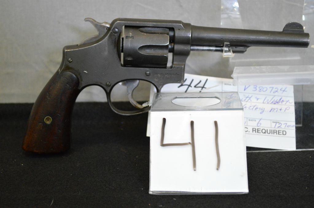 Smith & Wesson Mod Victory M & P .38 S & W cal 6 shot Revolver w/ 127 mm bbl [ flat war finish, fixed sights, some wear , A Broad Arrow F stamped on left side, also FTR / MA 53 L over Broad Arrow 29, w/ lanyard ring ] Ser # V 380724 Restricted Cert # TCI