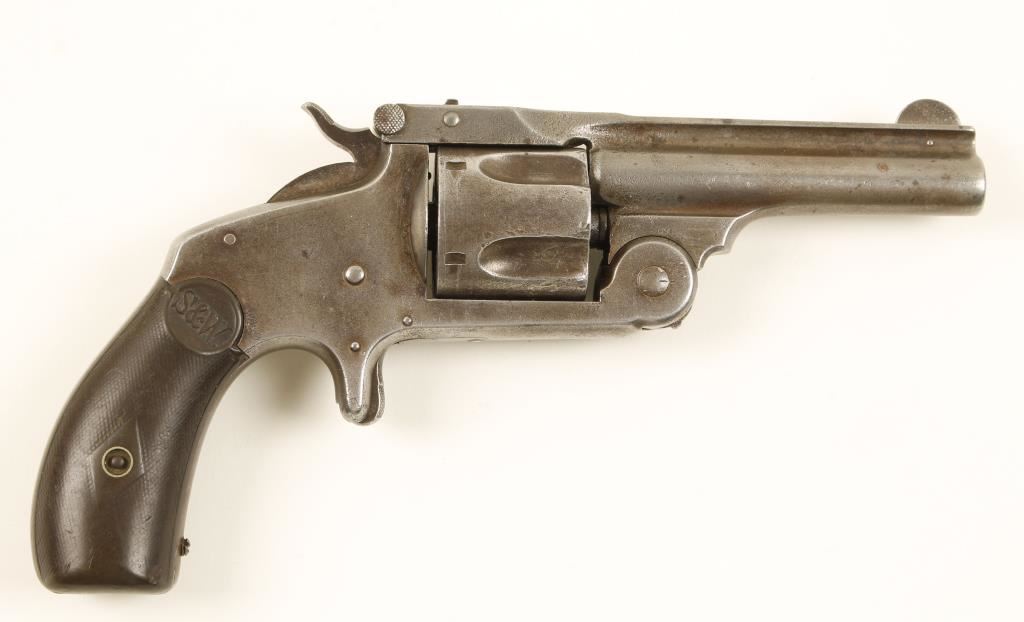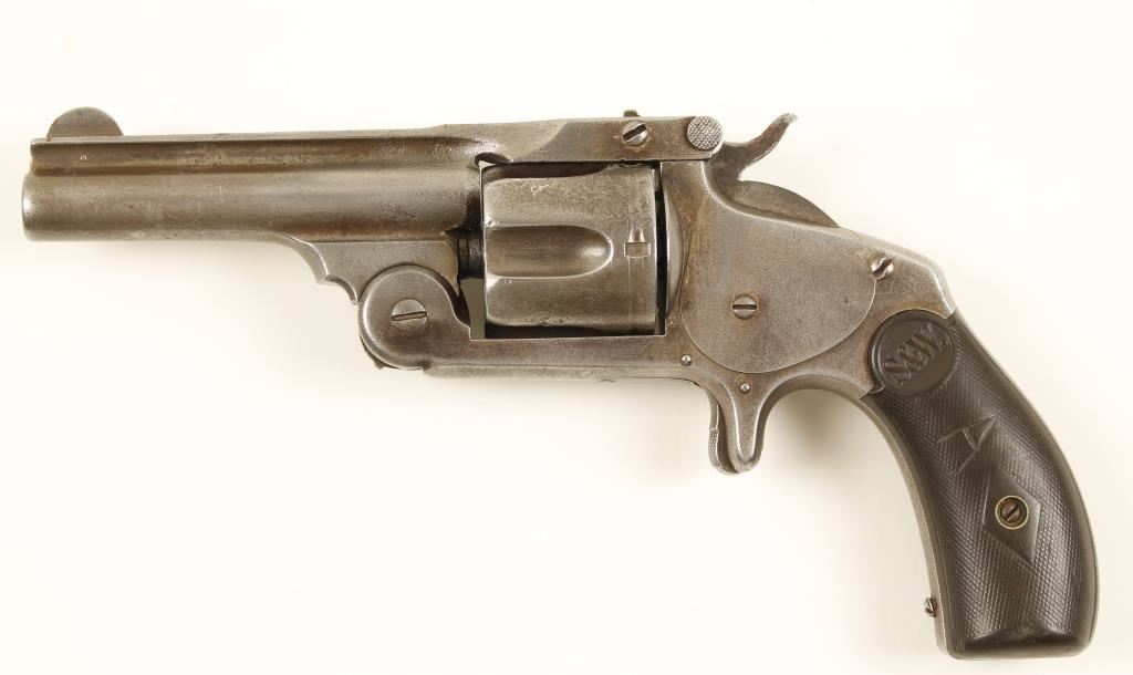 Blued single-action spur-triggered 5-shot top-break revolver with a 3-1/4" barrel. Finish is primarily worn to grey with bluing gone to brown in protected areas. There is much pin-prick pitting and evidence of surface rust. The cylinder has many dings in it. The bore has sharp rifling with some pitting and the chambers are in good shape. The extractor extends but won't retract when action is opened fully. Timing is off and cylinder sometimes rotates past locking bolt. Left grip has the letter "A" carved in it. Otherwise they are complete without cracks but they are worn smooth in spots and have a few dings and scratches. Condition is fair to good. *Antique Firearm*