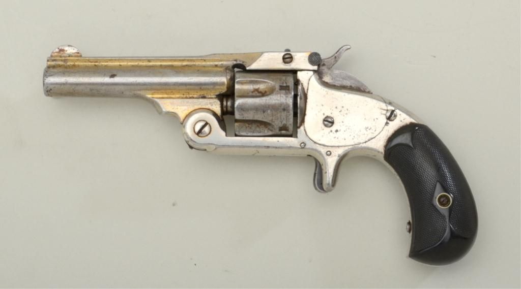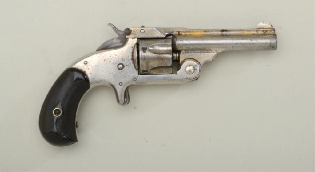 Smith & Wesson Model 1-1/2 New Model spur trigger top break revolver, .32 cal., 3” barrel, nickel finish with traces of gold wash in protected areas of the barrel assembly, checkered black hard rubber grips,#11525. This gun is in overall good to very good condition showing considerable original nickel on frame, traces of gold wash on barrel assembly with balance gone to a grey patina with some scattered spots of erosionoverall; good action and markings, fair bore, good grips. Should be factory lettered to establish if gold wash was factory or dealer applied. Est.: $150-$300.