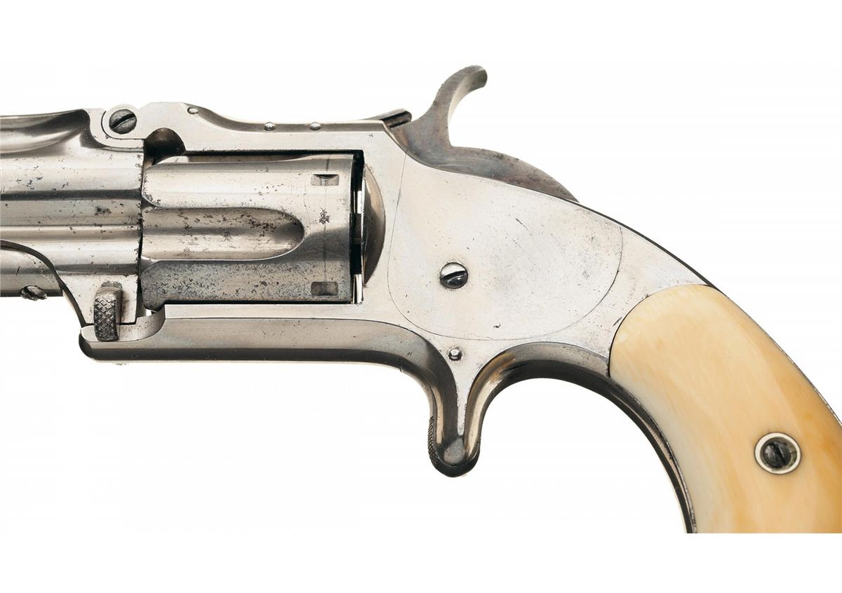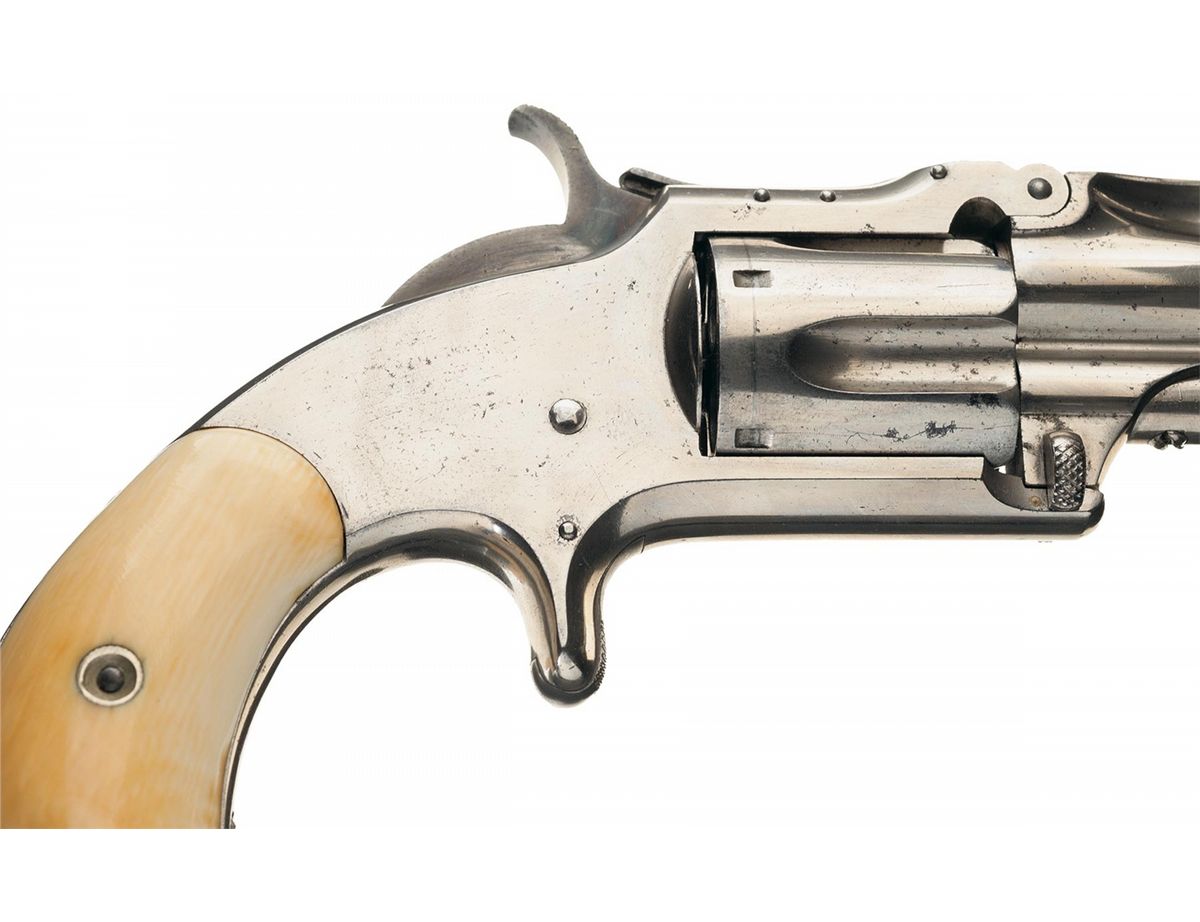 Manufactured from 1868 to 1875 this is very nice example of a Model 1 1/2, 2nd Issue revolver fitted with smooth bird head ivory grips. The top of the barrel rib has the one line address/patent dates (1855, 1859 and 1865) marking. It has a five shot fluted cylinder and nickel finish with casehardened hammer and trigger.