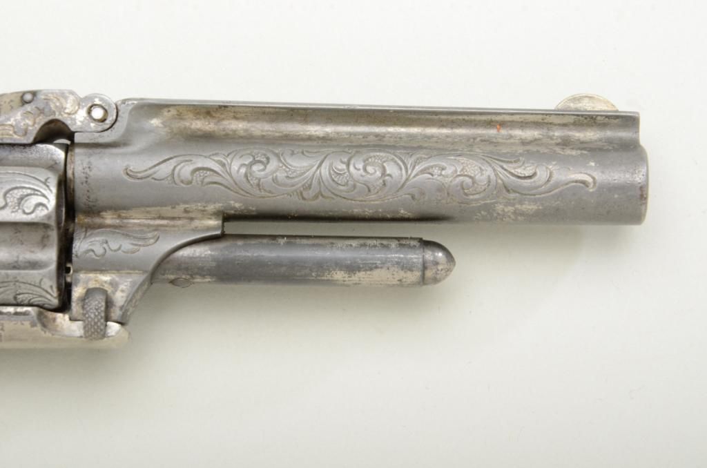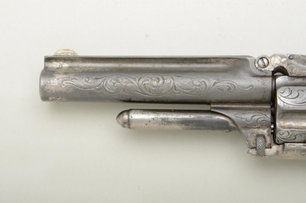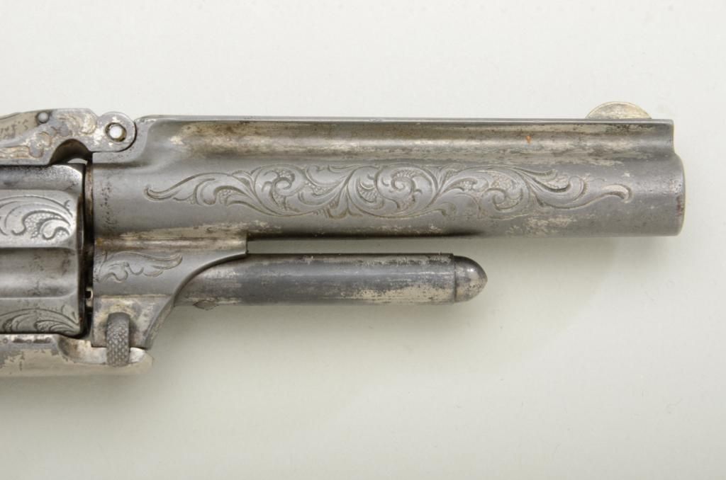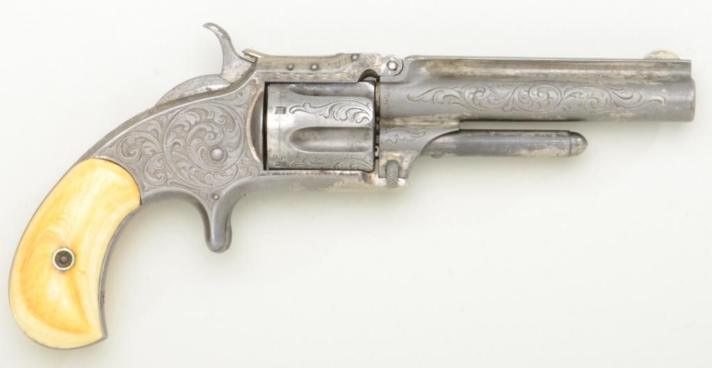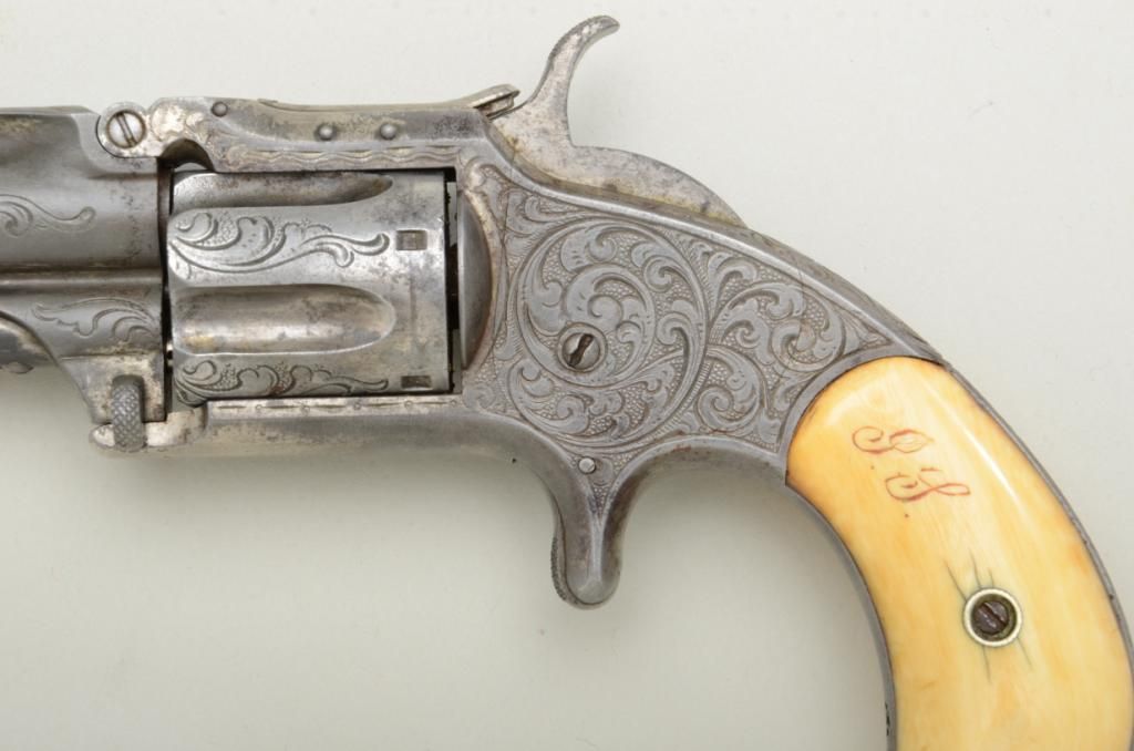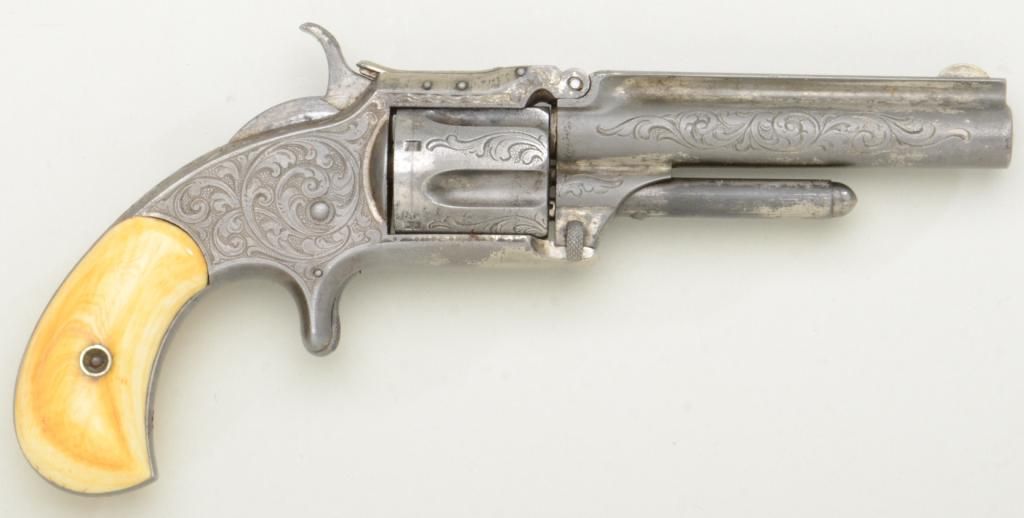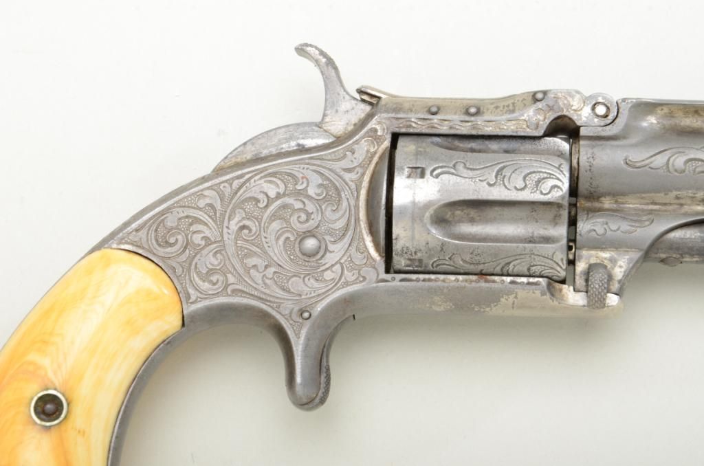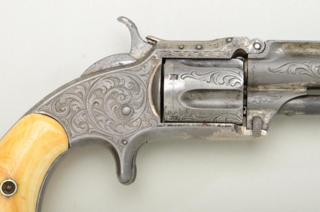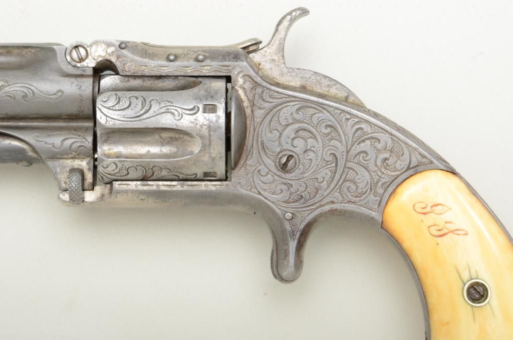 Smith & Wesson Model 1-1/2 Second Issue spur trigger tip-up revolver, engraved, .32 cal., 3-1/2” barrel, nickel finish, ivory grips with “J.L.” inscribed in script at top of left grip, #70030. This gun is in overallgood + condition showing traces of original nickel in protected areas, finely accomplished period New York style engraving, good markings, dark bore, hammer and trigger working, cylinder does not rotate and needshand mechanism replaced; grips are beautifully grained and mellow color from age and fit this revolver beautifully. Est.: $400-$800.