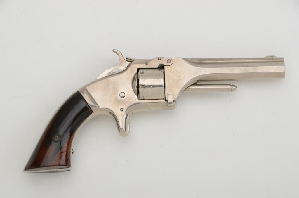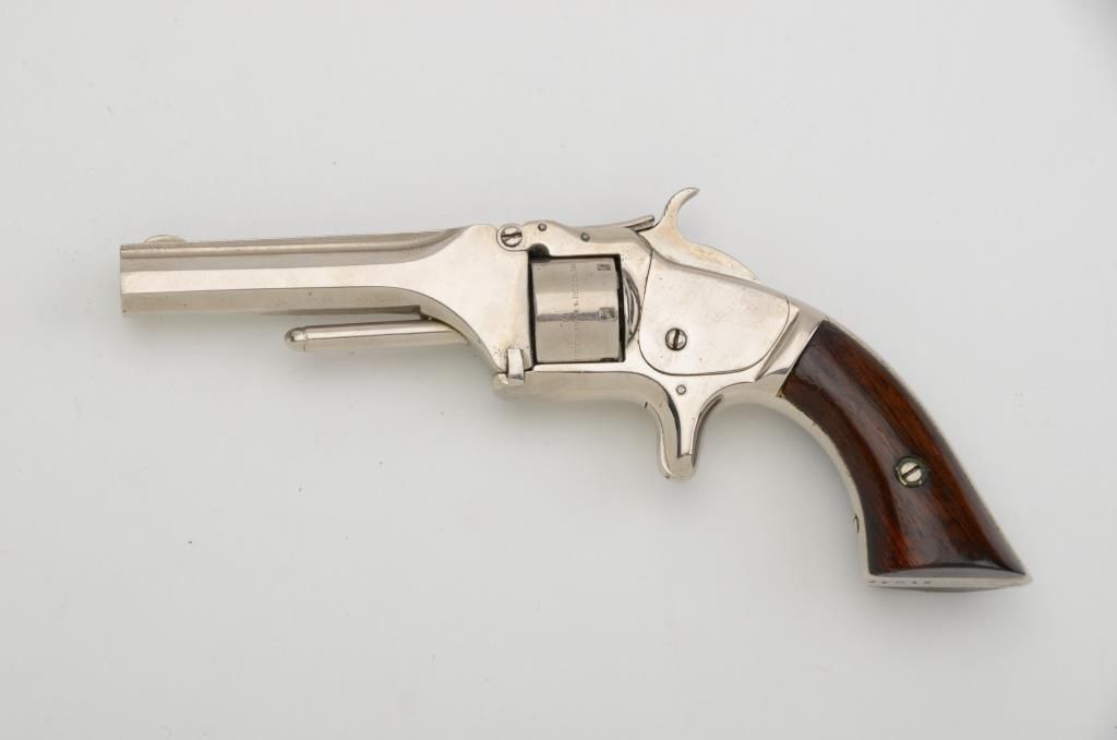 Smith & Wesson Model 1 2nd Issue spur trigger tip-up revolver, .22 cal., 3-1/4” barrel, rosewood grips, #51042. This gun is in overall good condition showing an old re-nickel finish, good action and markings,dark bore, very good grips. Est.: $300-$600.