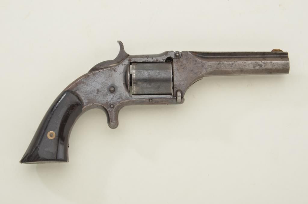 Smith & Wesson Model 1 ½ old model in .32 rim-fire caliber showing considerable original blue finish remaining and early production range serial number 1466 made during The Civil War. The revolver shows 30% to 50% original blue that is evenly drifting and toning to a patina. There are some minor scratches and some pin prick pitting and erosion. The barrel address is mostly legible. The grips are good other than small marks on the butt from being used as a tack hammer. The barrel is loose upon the center pin. The ejector rod was removed long ago and there are 2 initials scratched on the bottom of the frame by the serial number which appear to read T x. Keith and Lori Candee collection. Est.: $175 -$350.