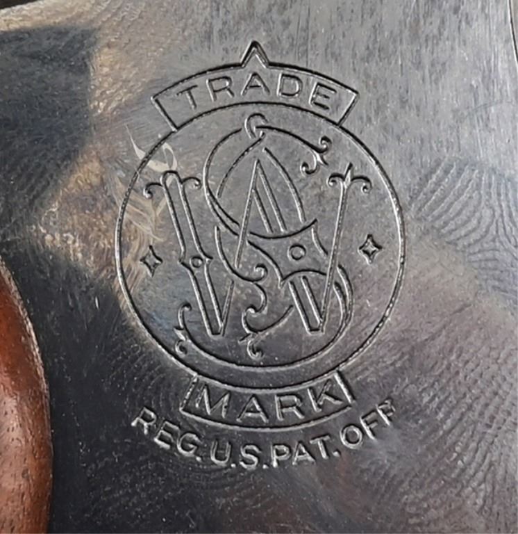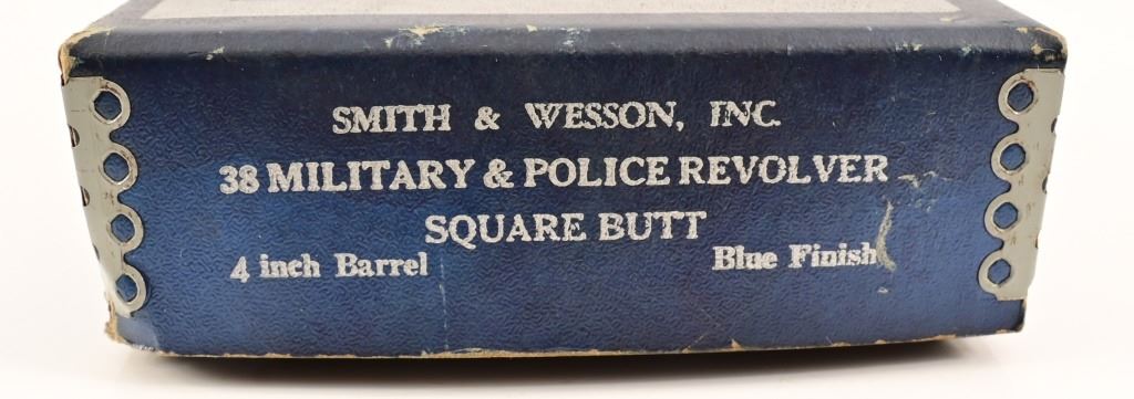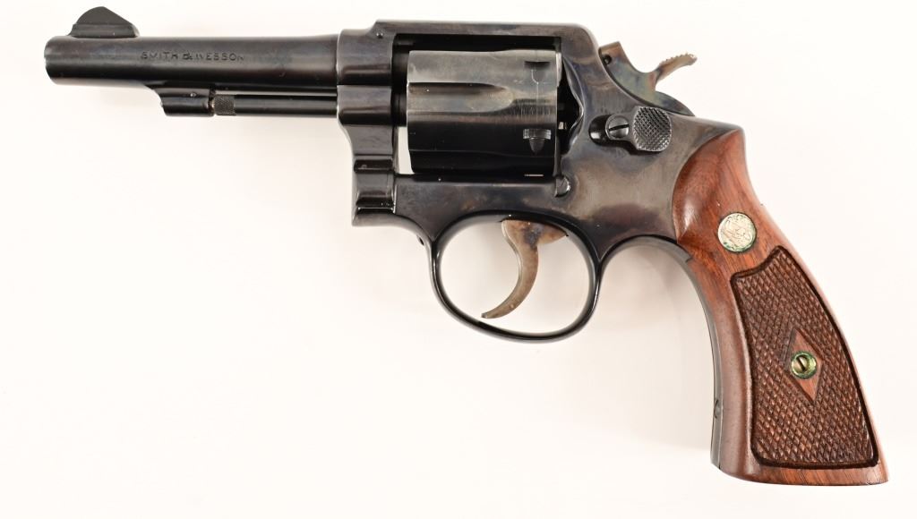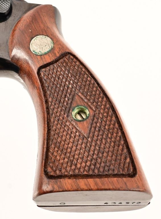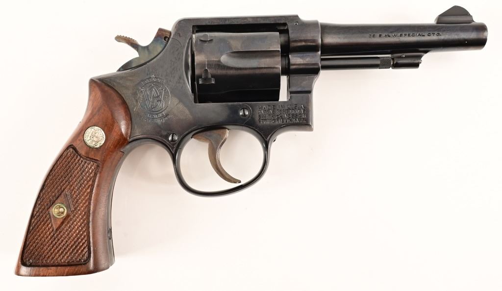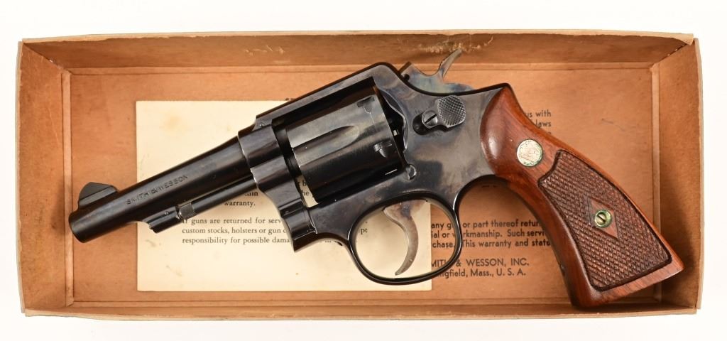 S/N C434972. S&W Model 10 no-dash, 4" barrel, diamond checkered wood grips, blue finish with case hardened standard trigger & hammer. With original blue cardboard box. 99%+ condition.
