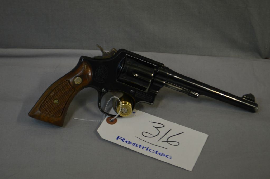 Smith & Wesson Model 10 - 5 .38 Spec Cal 6 Shot Revolver w/ 152 mm bbl [ blued finish, slight holster wear by muzzle both sides, fixed sights, case colored trigger & hammer, slight cylinder ring, checkered Smith & Wesson insignia grips show some wear ] Ser # D344403 Restricted Handgun Cert # 18709770