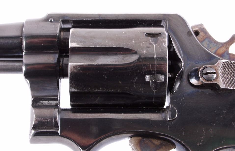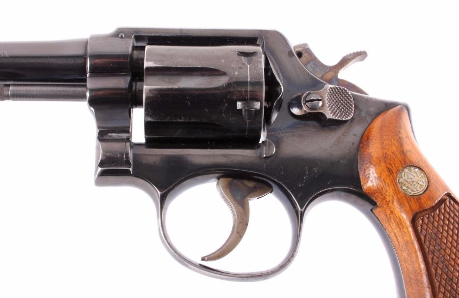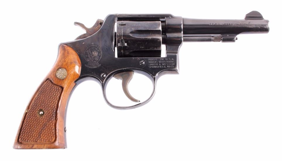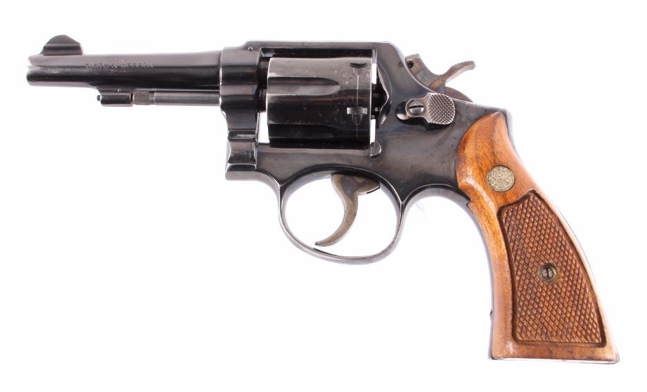 This is a Smith & Wesson Model 10-5 double action revolver chambered in the .38 Special caliber. The revolver shows a blued 4" barrel, frame and six shot cylinder with solid walnut hardwood checkered grips. The barrel is marked "Smith & Wesson" and "38 S.&W. Special CTG". The frame is marked with the Smith & Wesson emblem just below the hammer. The Smith & Wesson revolver is in good condition with normal holster wear. It measures 9.5" with a 4" barrel. Serial number is D566041. This is a modern manufactured handgun and requires NICS background check or FFL transfer.