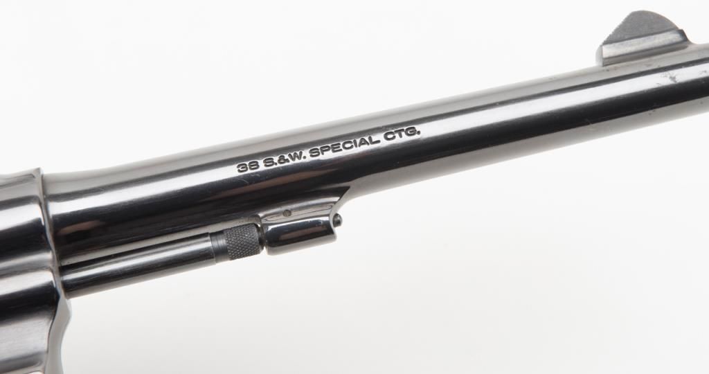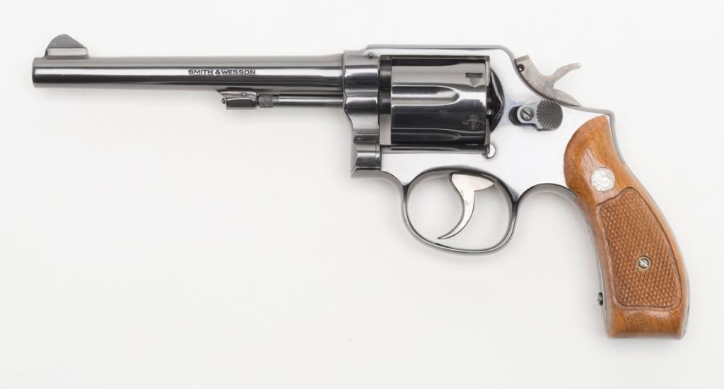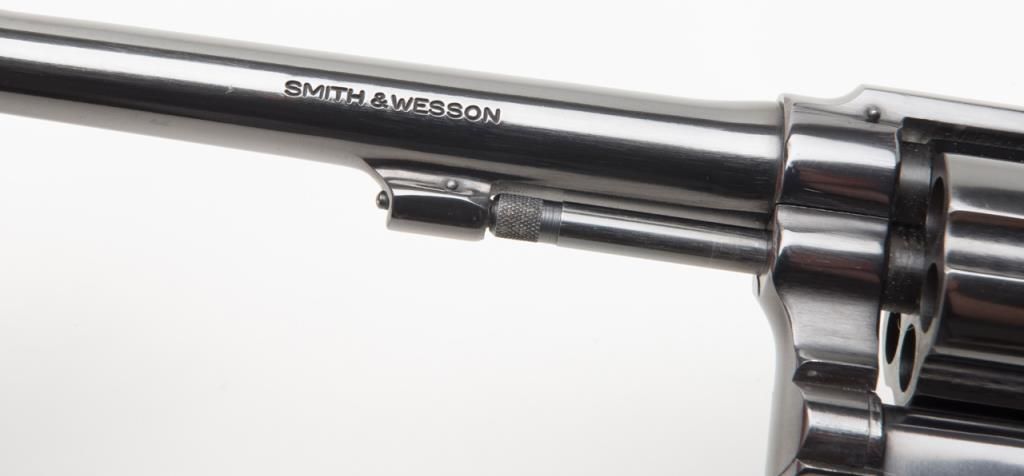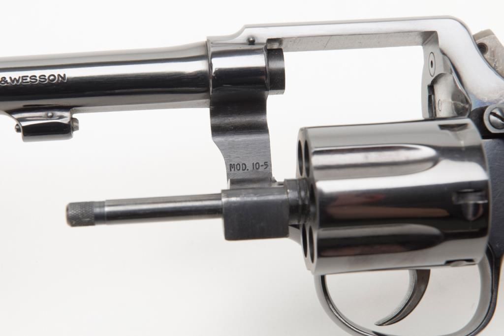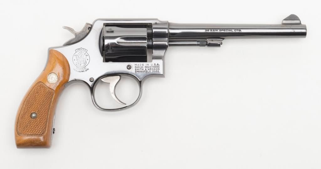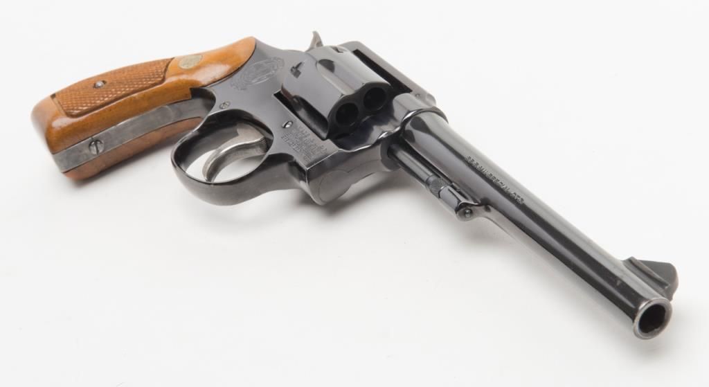 Smith & Wesson Model 10-5 DA revolver, .38 Special cal., 6” barrel, blue finish, checkered wood medallion grips, #2D93503 in overall fine condition showing the majority of its original finish with loss of finish only to grip straps;crisp action, sharp markings, fine bore and grips that are slightly undersized to this gun. (C&R/PPT). Est.: $250-$500.