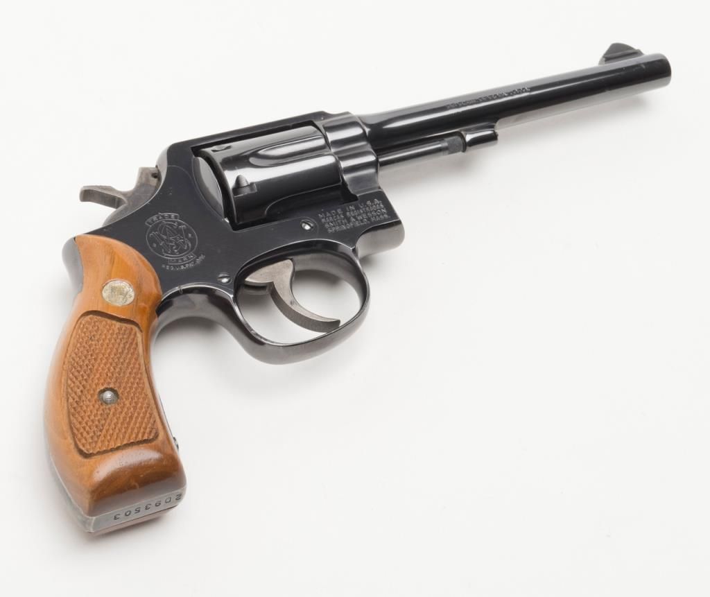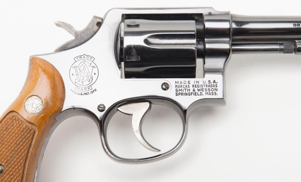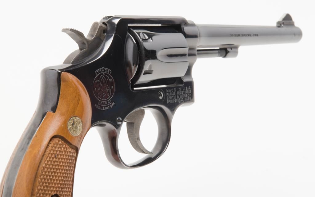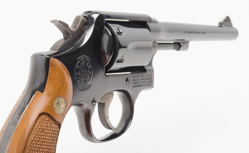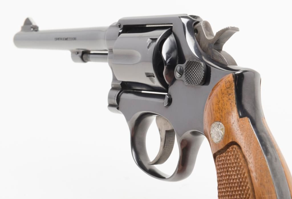 Smith & Wesson Model 10-5 DA revolver, .38 Special cal., 6” barrel, blue finish, checkered wood medallion grips, #2D93503 in overall fine condition showing the majority of its original finish with loss of finish only to grip straps;crisp action, sharp markings, fine bore and grips that are slightly undersized to this gun. (C&R/PPT). Est.: $250-$500.