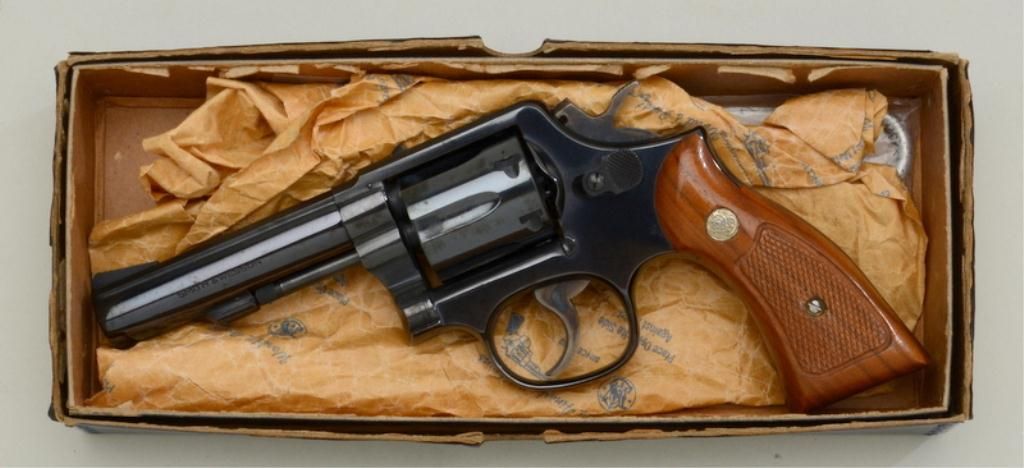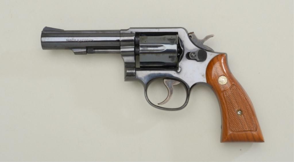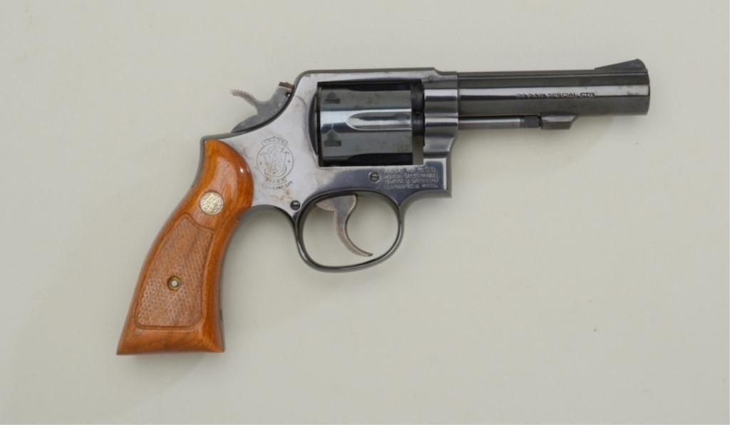 Smith & Wesson Model 10-8 DA revolver, .38 Special cal., 4” barrel, blue finish, checkered medallion wood grips, #5D48192; accompanied by factory blue two piece box with end label numbered to this gun withinstructions and cleaning rod. This gun is in overall fine condition showing the majority of its original finish, fine bore, crisp action and markings, fine grips; very good box. Est.: $250-$350.