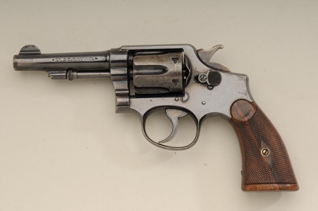 Smith & Wesson Model 10 in .38 special caliber, double action revolver with 4” barrel, blued finish checkered would grips, serial number 58652 on butt and 37636 on inside of frame. This early Model 10 shows50% to 70% original bright blue drifting at the high points and edges from holstering and handling. The barrel shows early markings on each side and the metal surfaces are good with some scattered erosion and lightpitting. The checkered wood grips are also very good. The hammer and trigger show 75% to 85% bright original case hardening. The markings and edges are fairly sharp and the action is good with the bore still bright.Probably made about 1911-12. Est.: $300 -$600