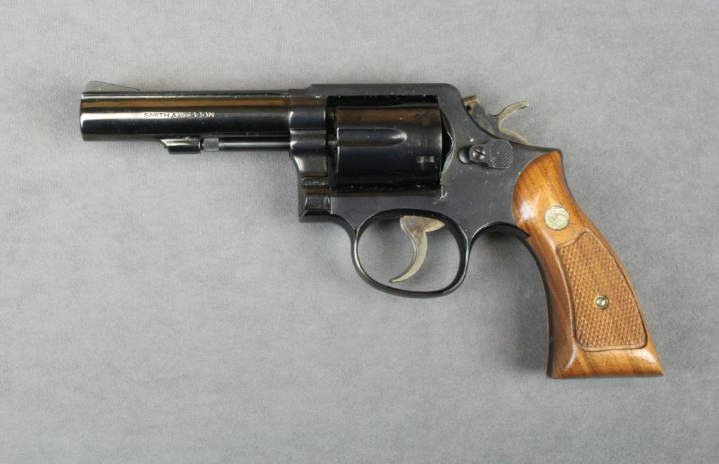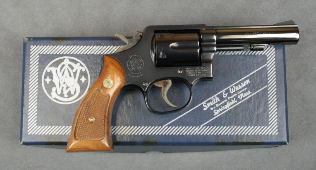 Smith & Wesson Model 13-1 heavy barrel DA revolver in original factory two-piece blue box with instructions and cleaning kit, special order .357Magnum caliber, 4” barrel, blue finish, checkered medallion wood grips,#2D38965. This gun is in overall excellent condition showing little use, excellent bore, action, markings and grips; box in overall fine condition. Est.: $300-$500.