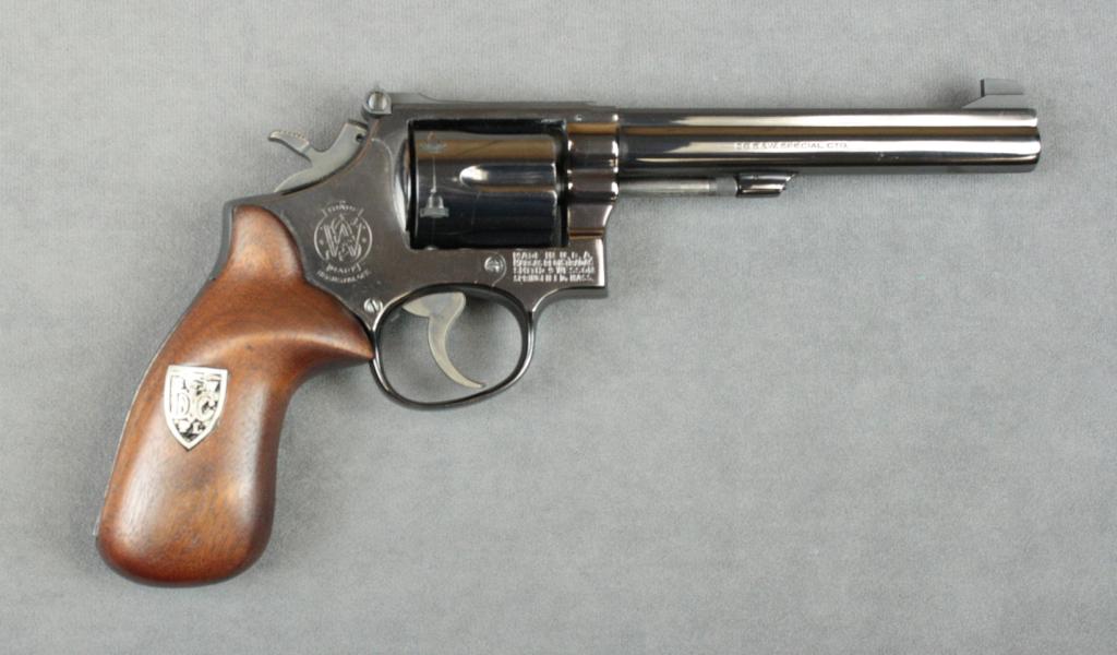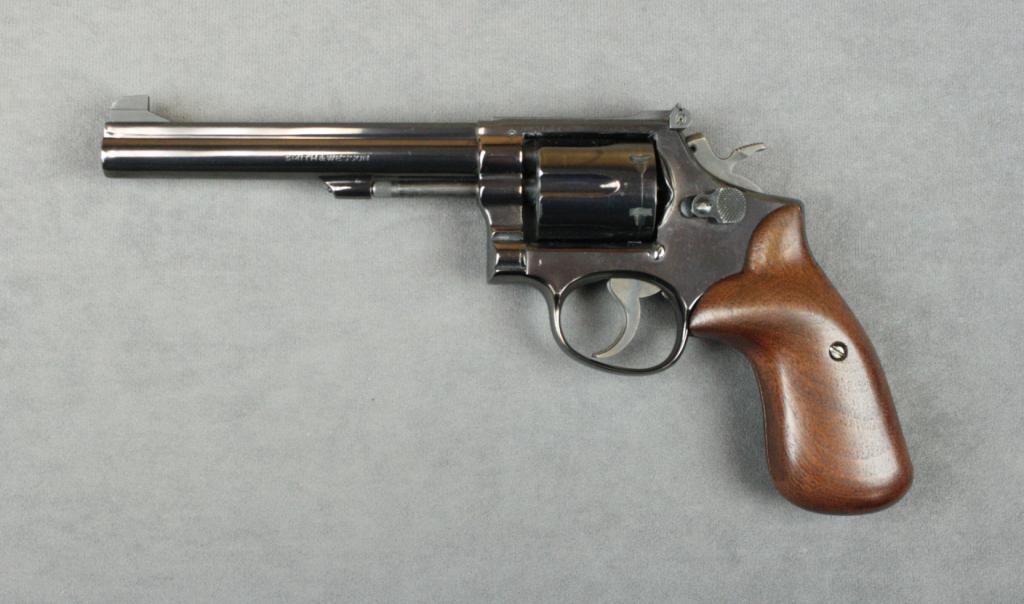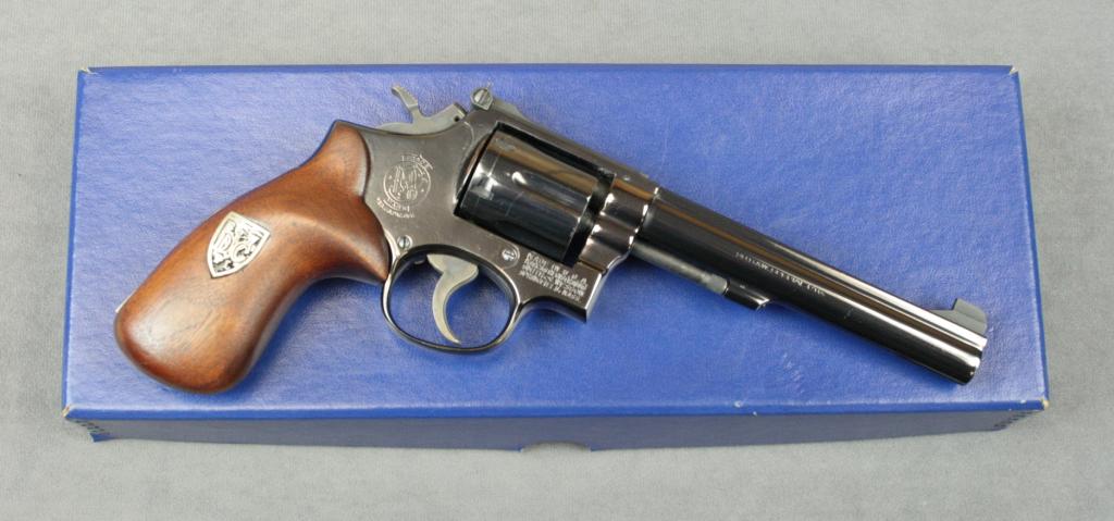 Smith & Wesson Model 14-3 DA revolver, .38 Special cal., 6” barrel, blue finish, custom smooth wood grips, #1K2545. This gun is in overall fine condition showing approx. 99% original finish, fine bore, crisp action,sharp markings, fine custom wood grips; accompanied by a two piece Smith & Wesson factory blue box with instructions and misc. factory paperwork. Est.: $300-$500.