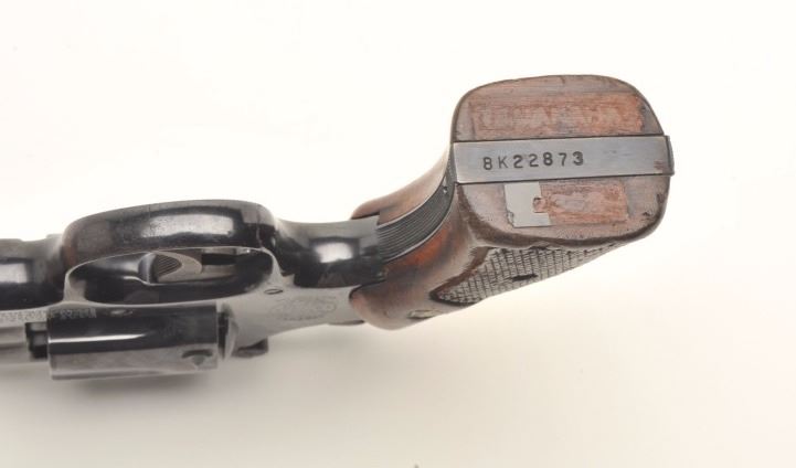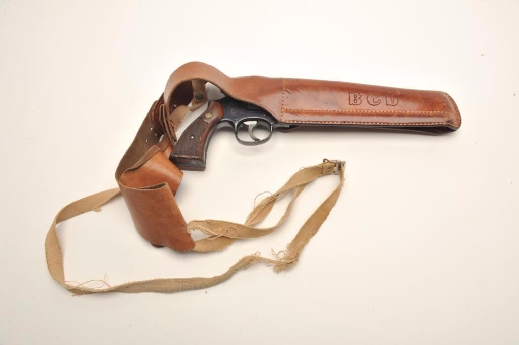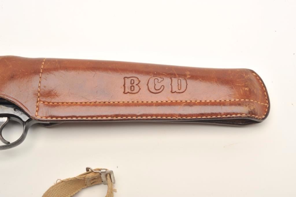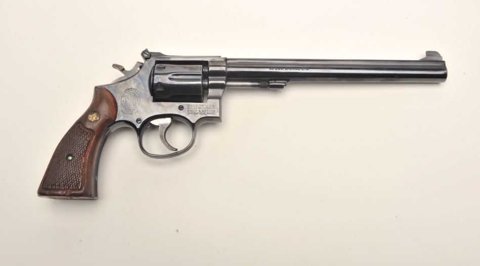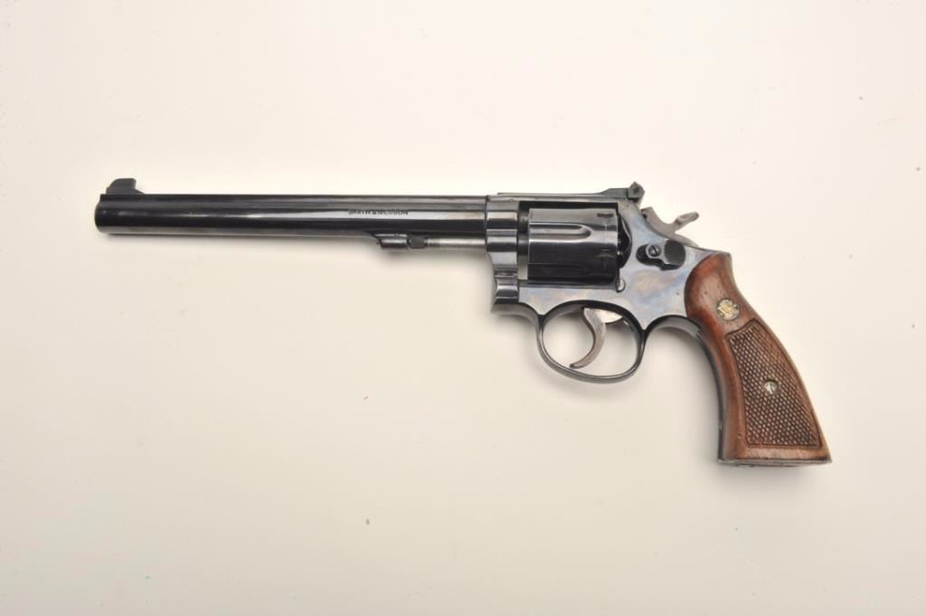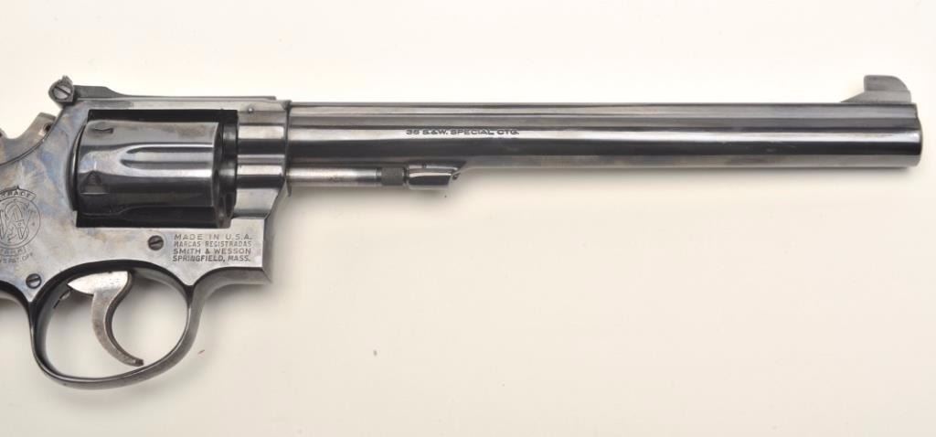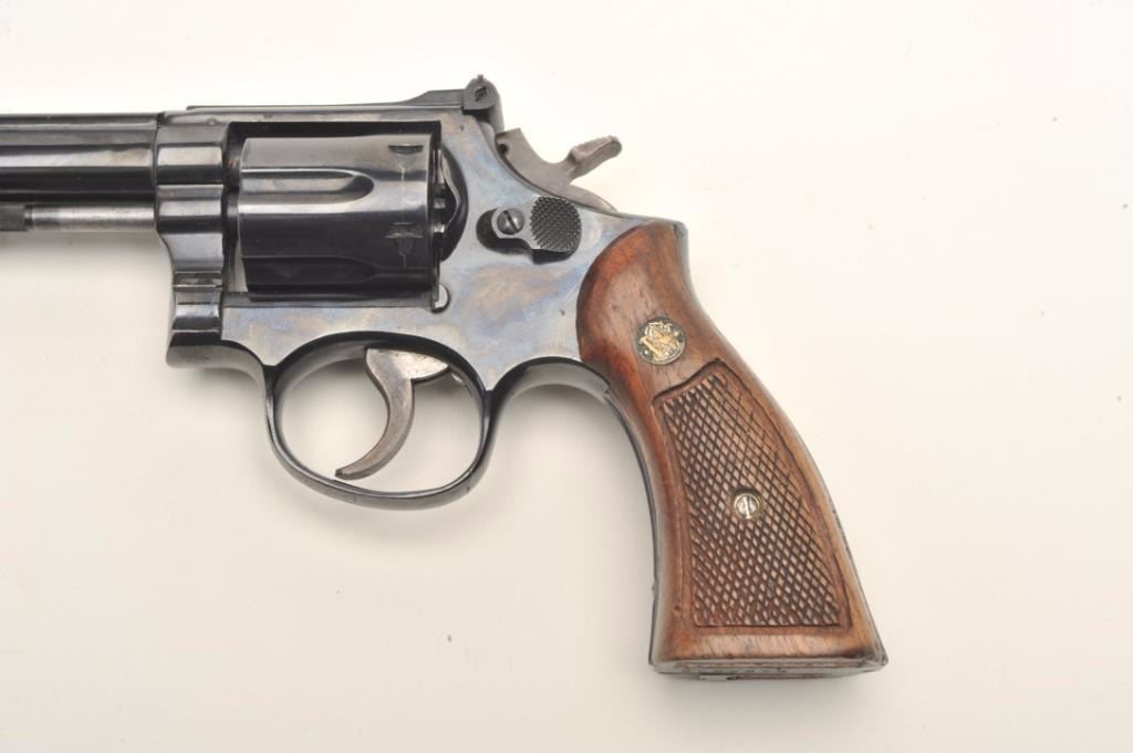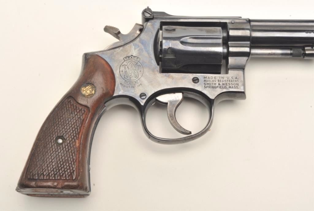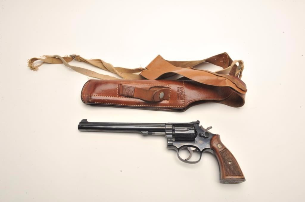 Smith & Wesson Model 15-3 DA revolver, .38 Special caliber, 8.375” barrel, blued finish, checkered wood medallion grips, S/N 8K22873; overall very good to fine condition displaying the majority of its originalfinish, fine bore, crisp action, sharp markings, grips are worn but overall good. Accompanied by a Bianchi leather shoulder holster with “BCD” initials; note that the 8.375” barrel length is no longer inproduction. (Modern/NO CALIF. SALE). Est.: $500-$1,000.