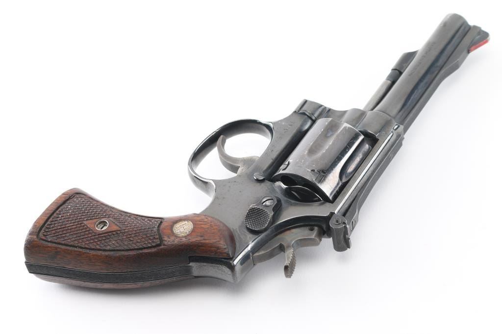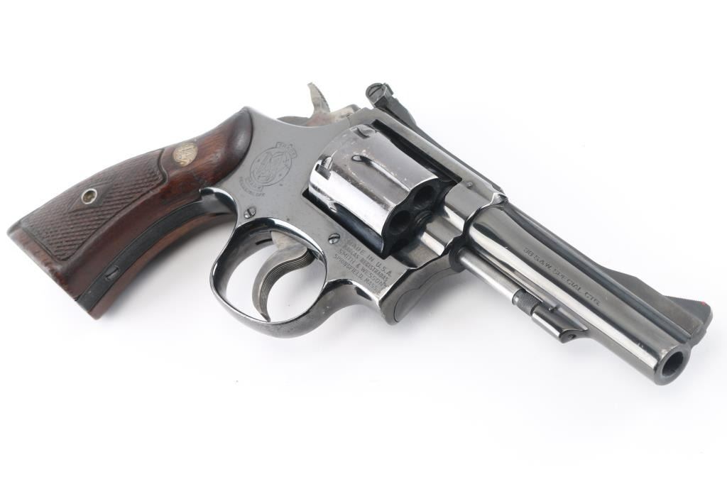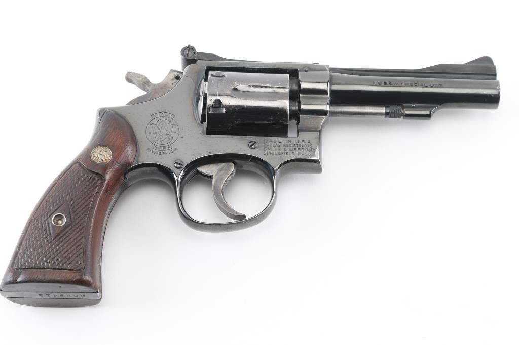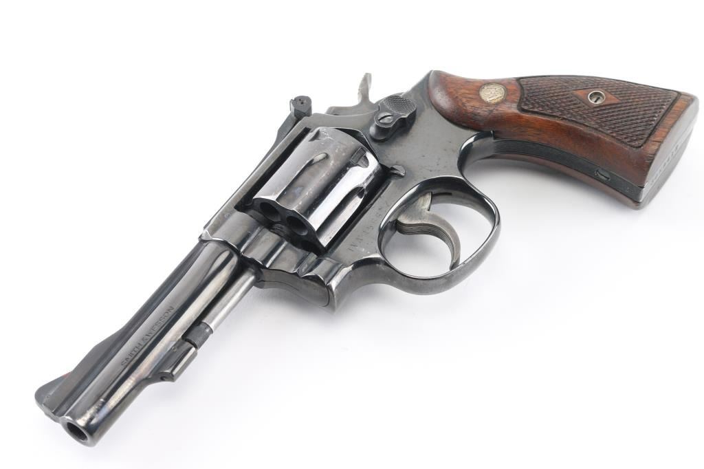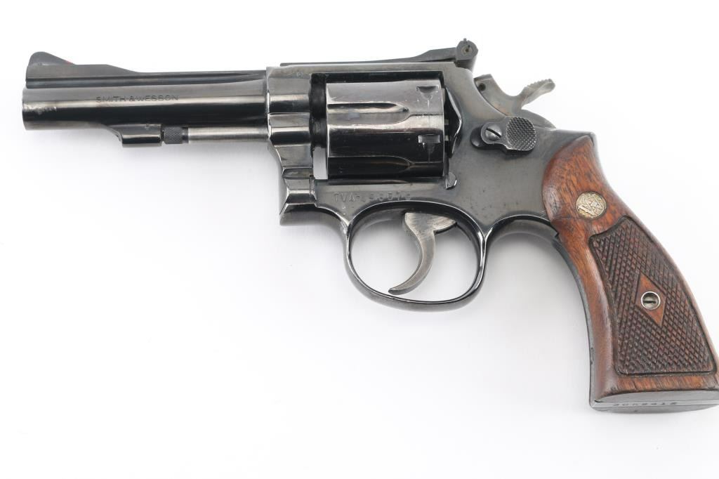 "TVA-456672" marked (stamped on left side of frame) medium frame double/single action revolver circa 1978-79. Features blued finish, checkered wood Magna style grips with S&W medallions, 4" barrel, adjustable sights, grooved trigger, knurled spur hammer. Bore and cylinder charge holes are very good. Retains 80% dark colored blue with holster wear at muzzle, edge losses, cylinder drag line, handling marks, patina forming in several small areas. Grips are very good condition. Action is smooth, lock-up is tight. Markings possibly for Tennessee Valley Authority. Condition is NRA Very Good *** Modern Firearm ***