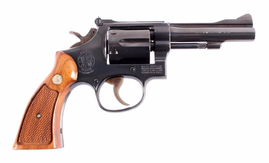 This is a Smith & Wesson Model 15-4 double action revolver chambered in the .38 S.&W. Special caliber. The revolver features a blued 4" barrel, frame and cylinder with solid walnut hardwood checkered grips. The barrel is marked "Smith & Wesson" and "38 S.&W. Special CTG". The frame is marked with the Smith & Wesson emblem just below the hammer. The revolver is in good condition with 98% original finish. Serial number is 97K8213. This is is a modern manufactured handgun and requires NICS background check or FFL transfer. The revolver measures 9.5" with a 4" barrel.