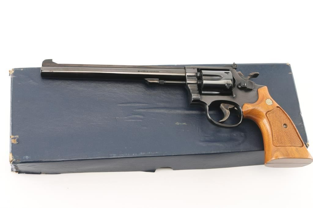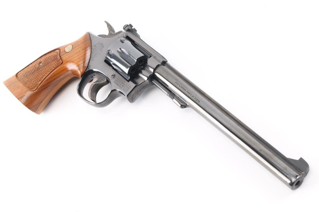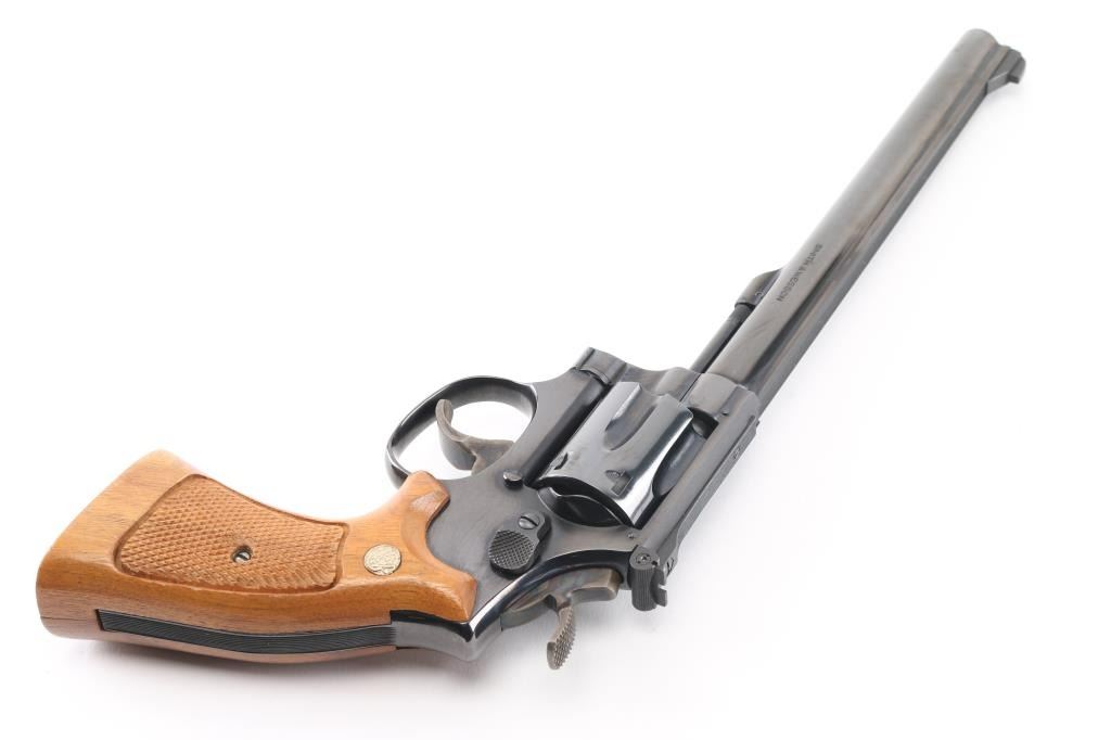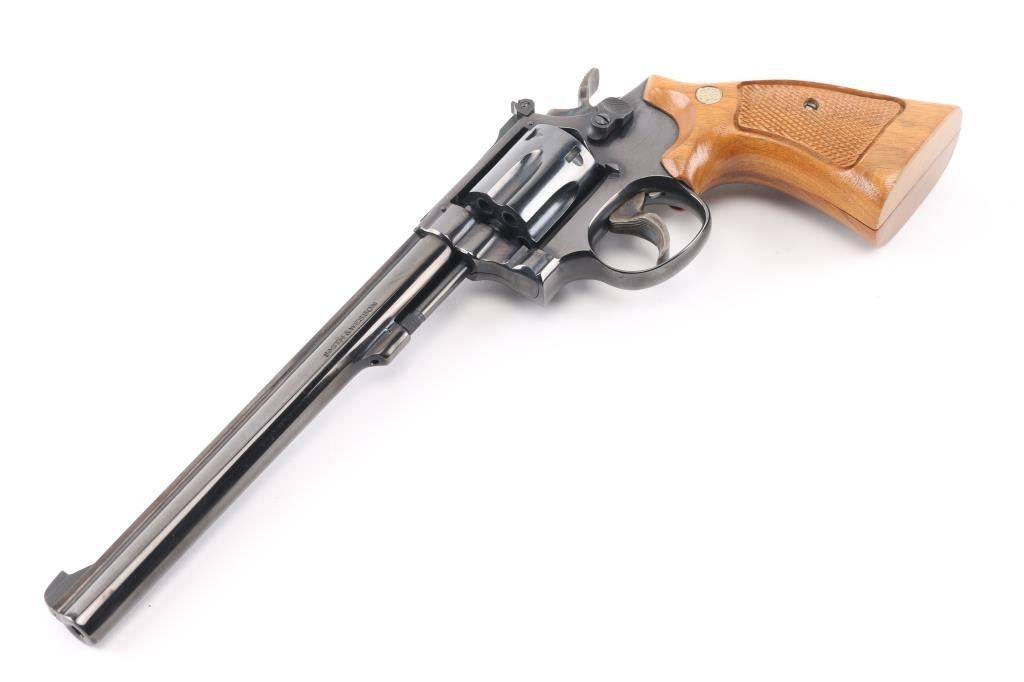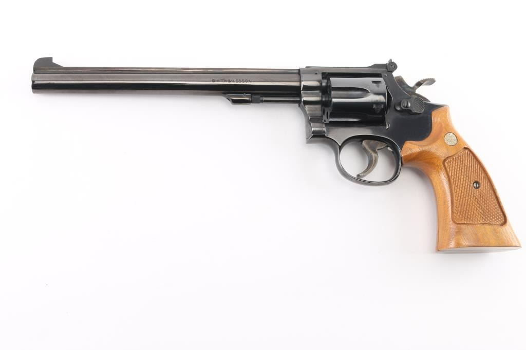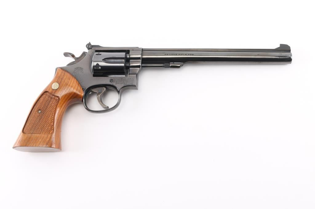 'The K-22 Masterpiece' Medium frame double action revolver chambered in .22 Long Rifle, manufactured circa 1980. Features a blued finish, pinned 8 3/8" barrel with serrated sighting rib, raised patridge front sight, adjustable micrometer click rear sight, fluted six-shot cylinder with counterbored chambers, non-shrouded ejector rod, serrated target trigger, target hammer, three screw square butt K target frame with ten groove grip straps, and two-piece checkered walnut target grips with S&W medallions. Bore is very good. Retains 95% finish with handling marks, thin cylinder drag line. Grips are very good condition with several light scratches. Action is smooth with tight lock-up. Includes a factory two piece blue cardboard box with documents, parchment paper. Condition is NRA Excellent *** Modern Firearm ***
