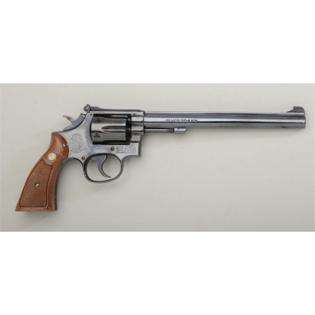Smith & Wesson Model 17-4 DA revolver, .22LR, 8-3/8” barrel, blue finish, checkered medallion wood grips, #81K2678. This gun is in excellent condition showing approx. 99% original finish, fine bore, action, markingsand grips. Est.: $350-$650.