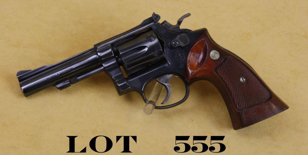 Smith & Wesson Model 18-4 DA revolver, .22LR cal., 4” barrel, blue finish, target hammer and trigger, combat checkered wood medallion grips, #228K806. This gun is in overall very good condition showing 90% original blue with some high point and muzzle wear; very good bore, action and markings; the grips are overall good with wear and nicks and mars on the butt area. Est.: $240-$400.