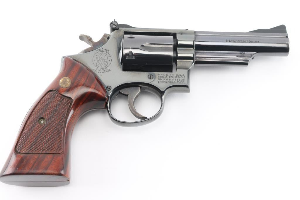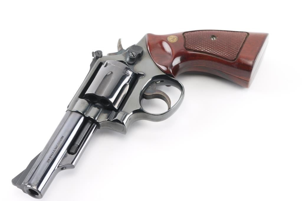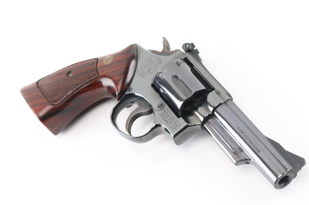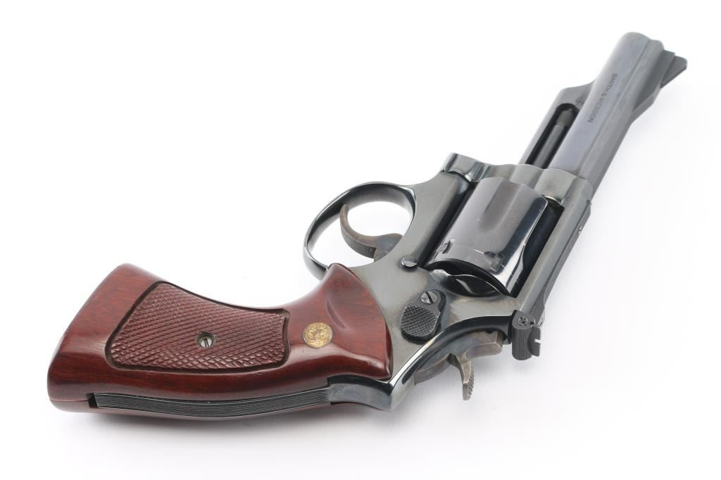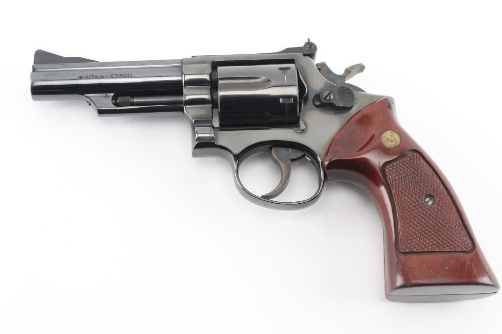 Double/single action revolver manufactured circa 1975. Pinned barrel & recessed cylinder for cartridge rims. Features blued finish, checkered wood target style grips with S&W medallions, 4" barrel, adjustable sights with ramp front blade, case colored grooved narrow trigger, case colored checkered medium width spur hammer. Bore and charge holes are very good condition. Retains 90% finish with edge losses, drag line, handling marks. Grips are near excellent. Action is smooth with tight lock-up. Condition is NRA Very Good++ *** Modern Firearm ***