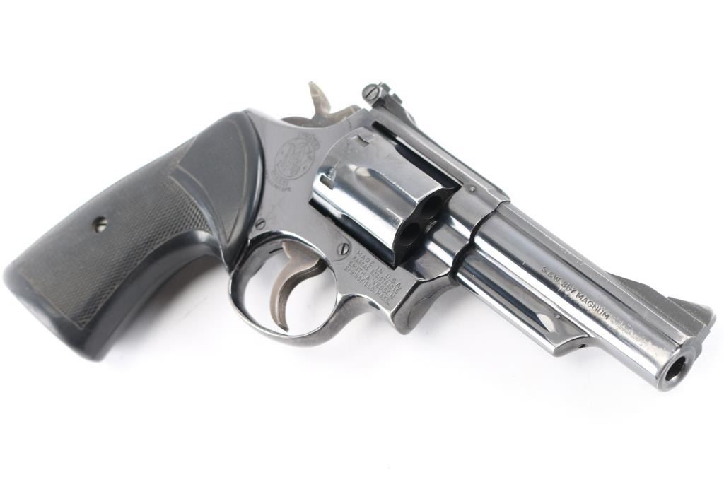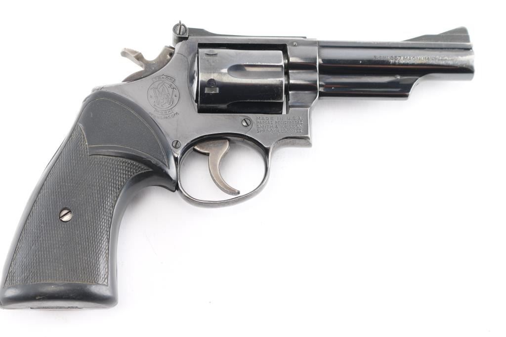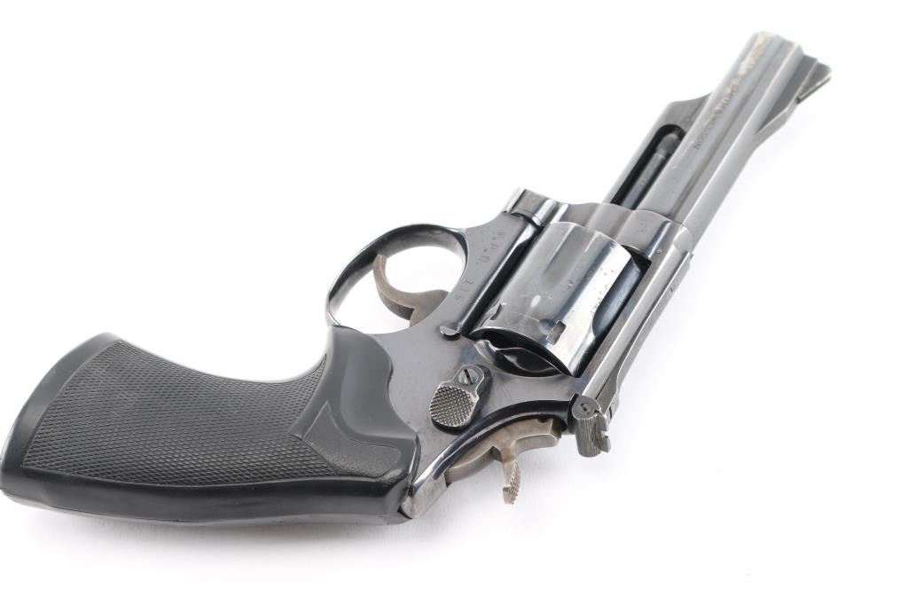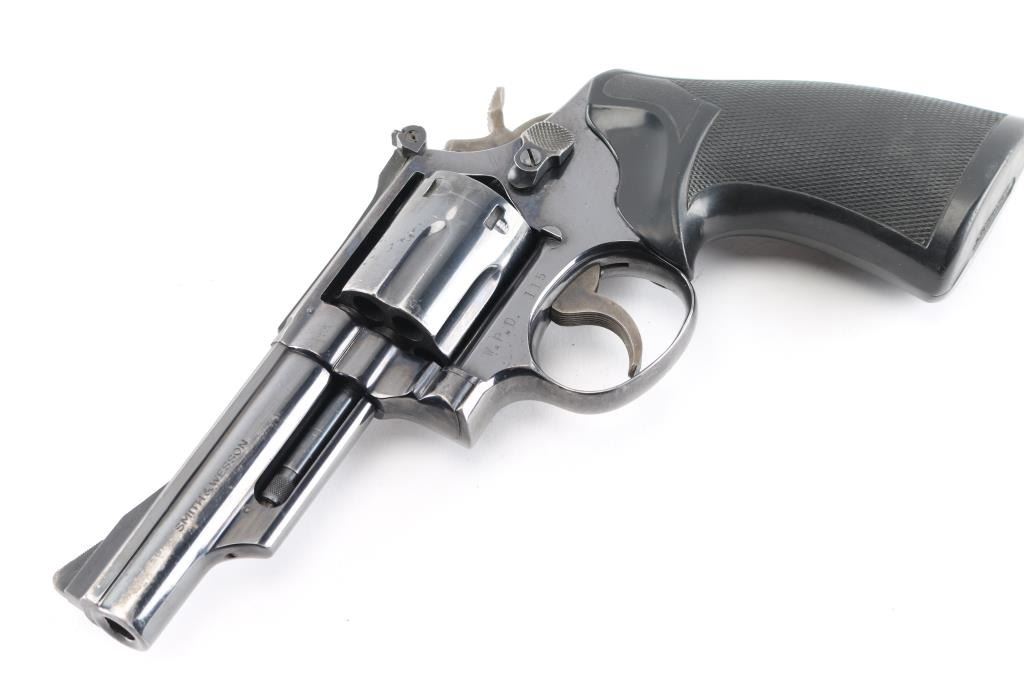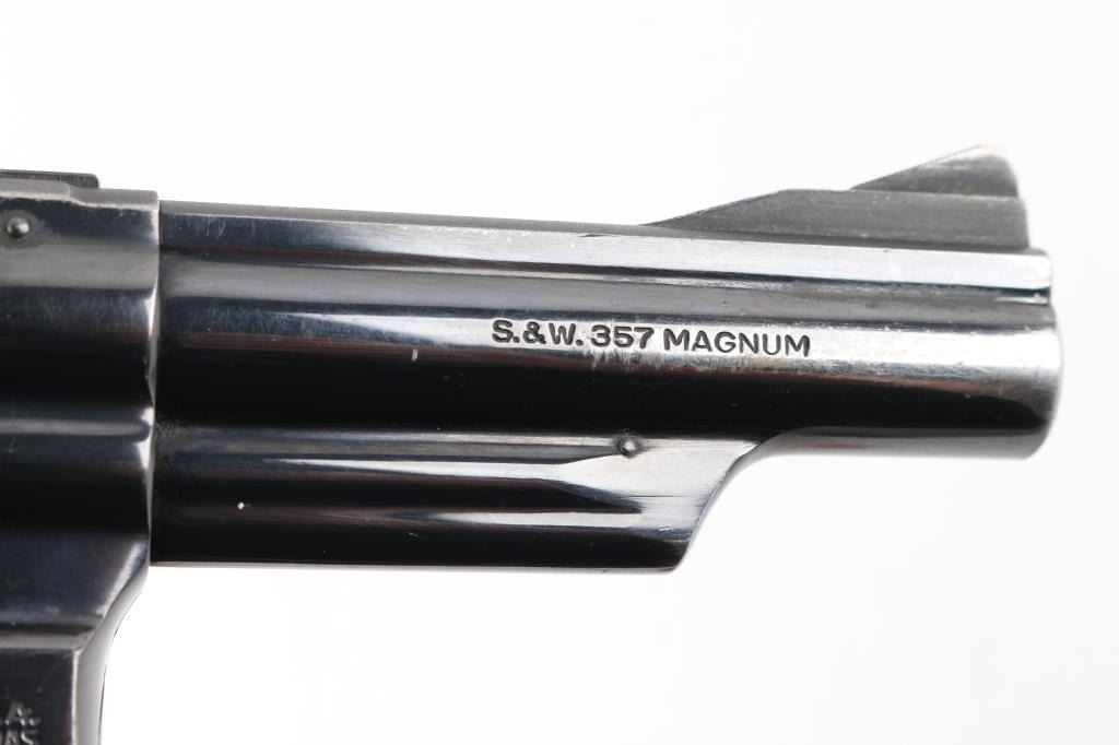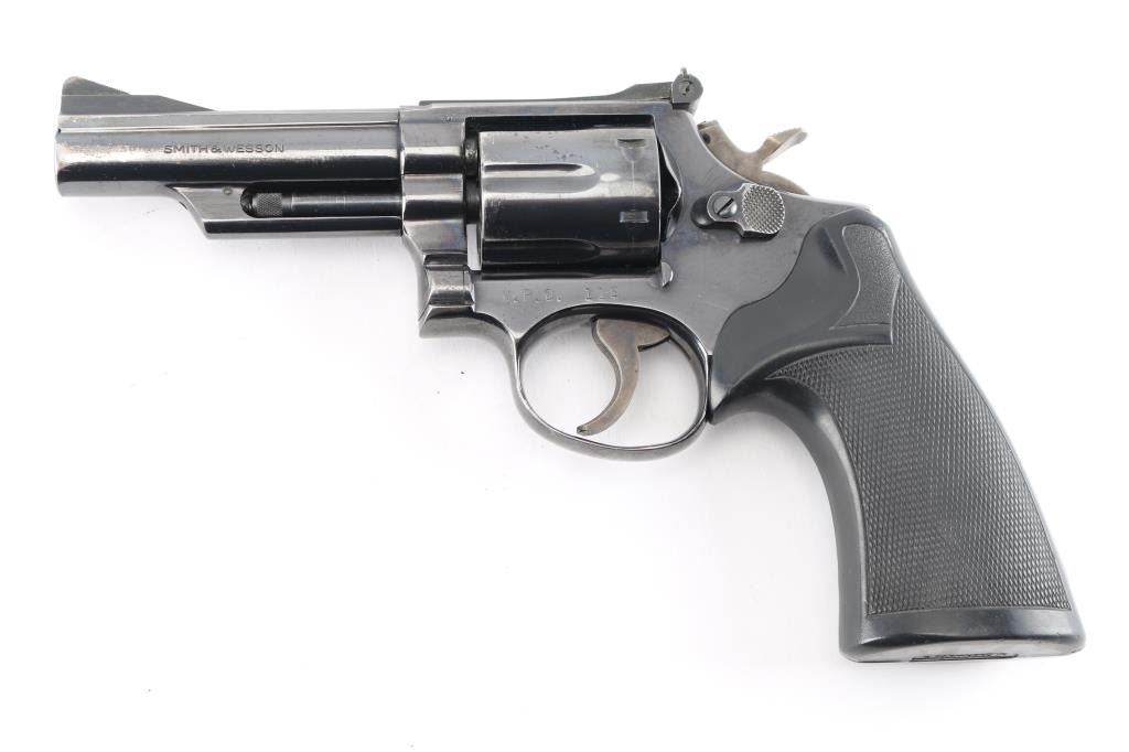 SN: 7K66855. "The .357 Combat Magnum". Double action magnum revolver manufactured circa 1975. Features blued finish, case color trigger & hammer, 4" barrel, serrated blade front and adjustable rear sights, 6 shot fluted cylinder, 3 screw square butt target K frame, Pachmayr rubber grip. The lower left frame is stamped "W.P.D. 115". Not sure what Police Dept., a S&W letter would tell you. Very good shiny bore. Retains about 80% plus original finish with holster wear, scratches, typical of LE revolvers. Action is crisp and the grips are very good.