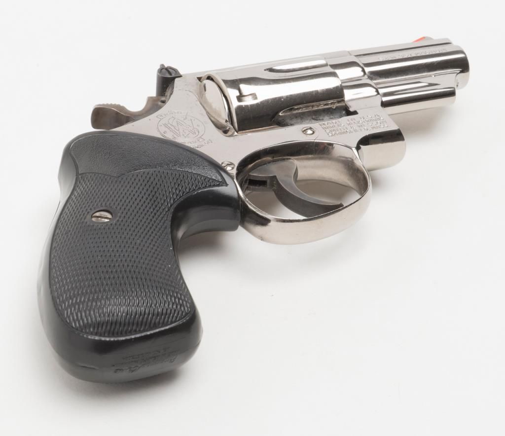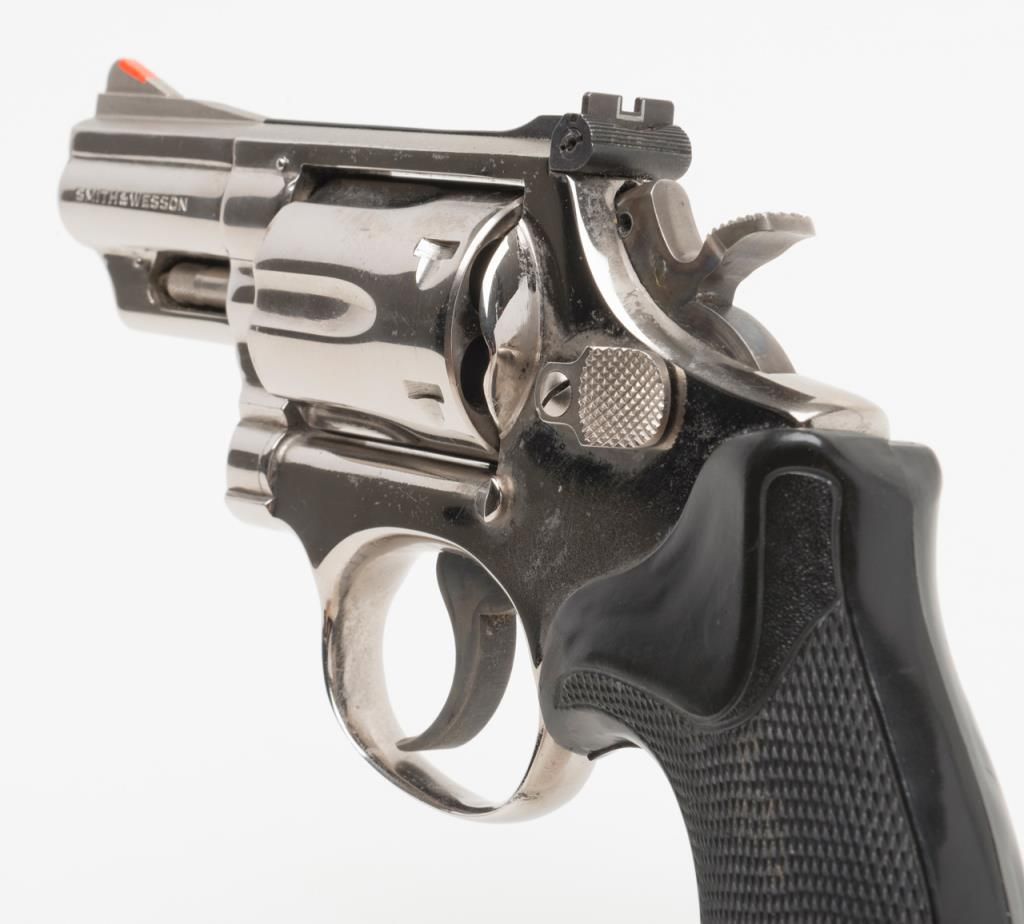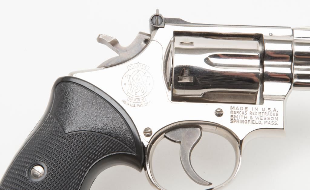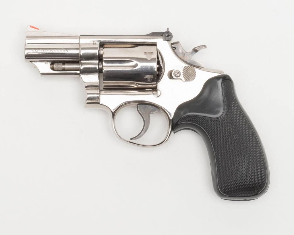 Smith & Wesson Model 19-3 DA revolver, .357 Magnum cal., 2-1/2” barrel, nickel finish, checkered hard rubber Pachmayr grips, #1K53133 in overall very good to fine condition showing the majority of its original finish, very good + bore, crispaction, sharp markings and grips. (Modern/PPT). Est.: $300-$600.