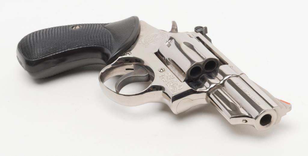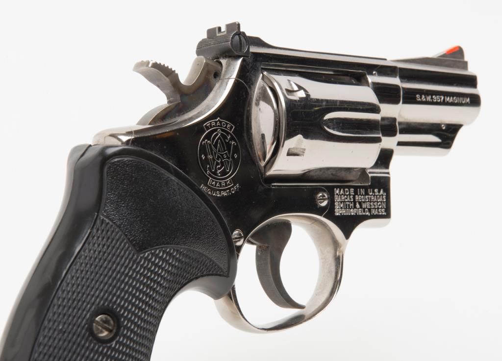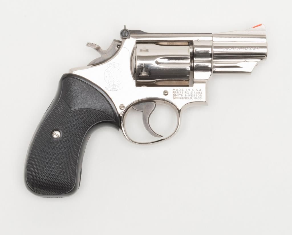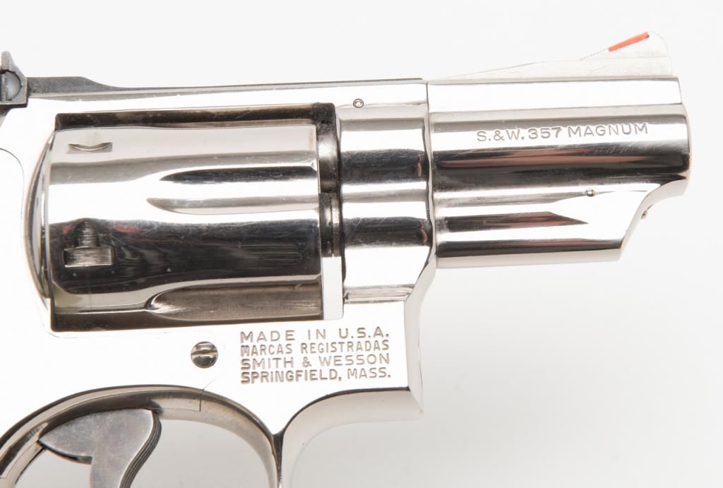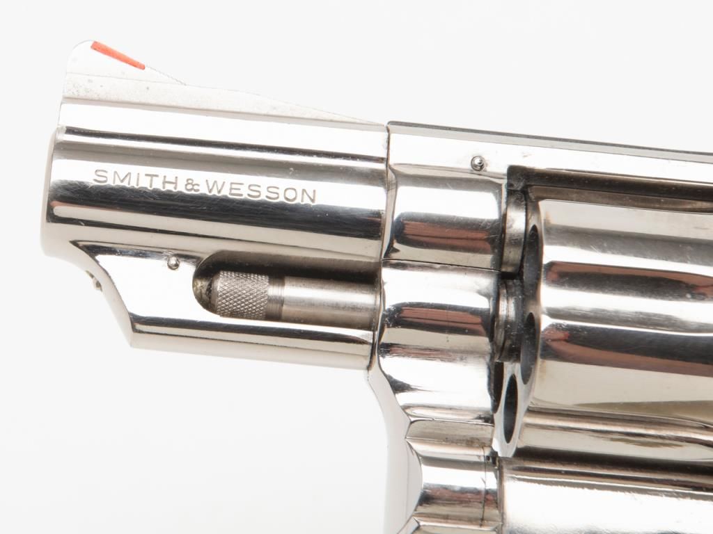 Smith & Wesson Model 19-3 DA revolver, .357 Magnum cal., 2-1/2” barrel, nickel finish, checkered hard rubber Pachmayr grips, #1K53133 in overall very good to fine condition showing the majority of its original finish, very good + bore, crispaction, sharp markings and grips. (Modern/PPT). Est.: $300-$600.
