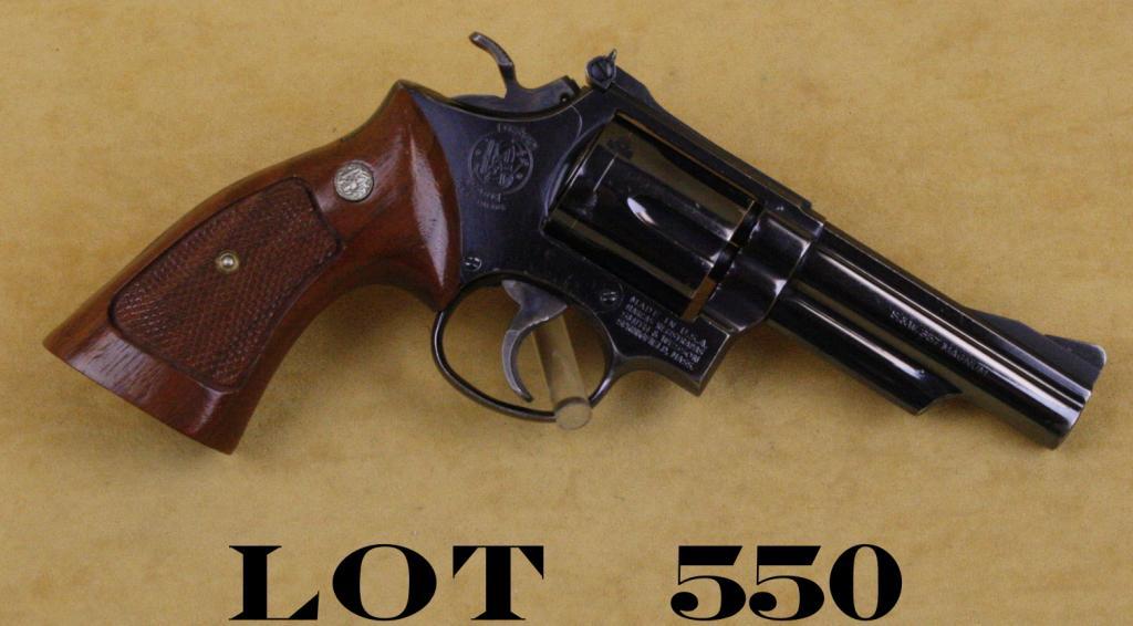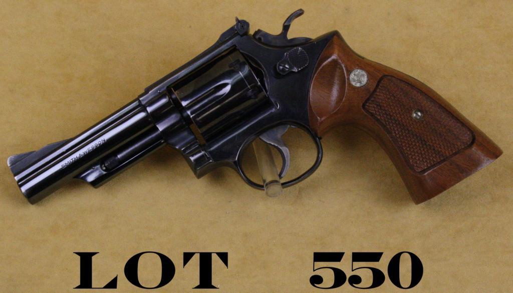 Smith & Wesson Model 19-3 DA revolver, .357 Magnum caliber, 4” barrel, blue finish, target hammer and trigger, combat checkered medallion wood grips, #7K62759. This gun is in overall very good condition showingapprox. 97% original blue finish with muzzle and high point wear; very good bore, action and markings; grips are also very good. Est.: $200-$300.