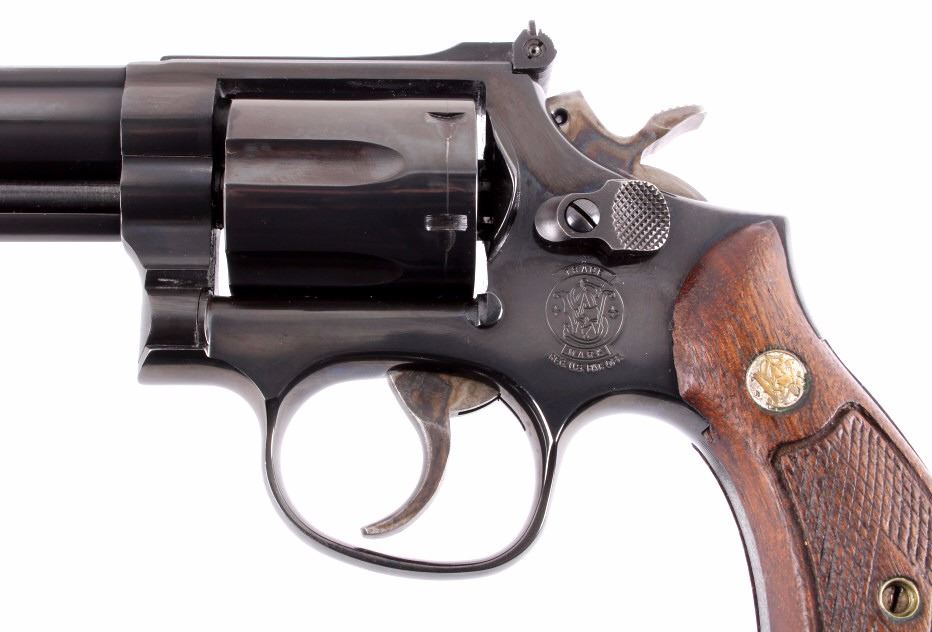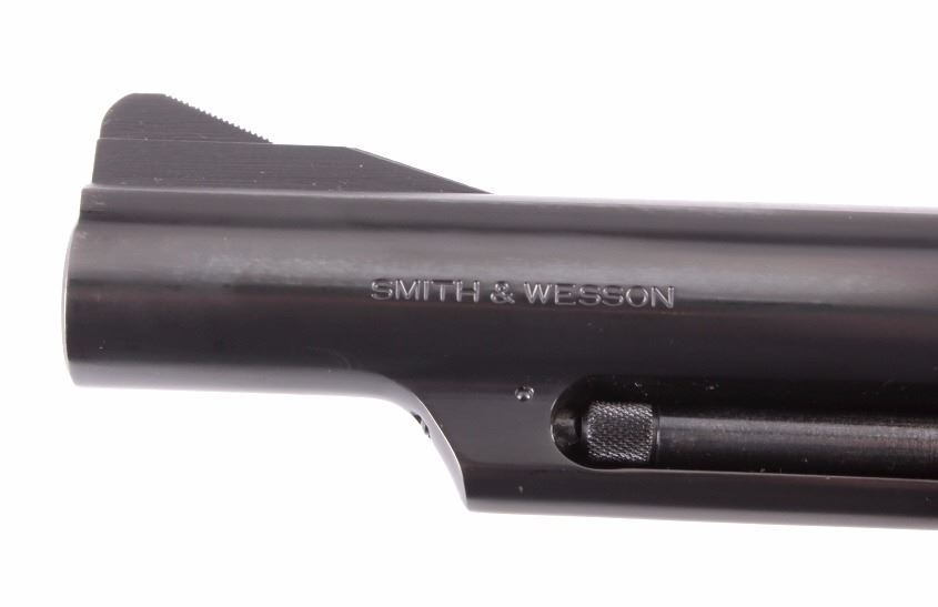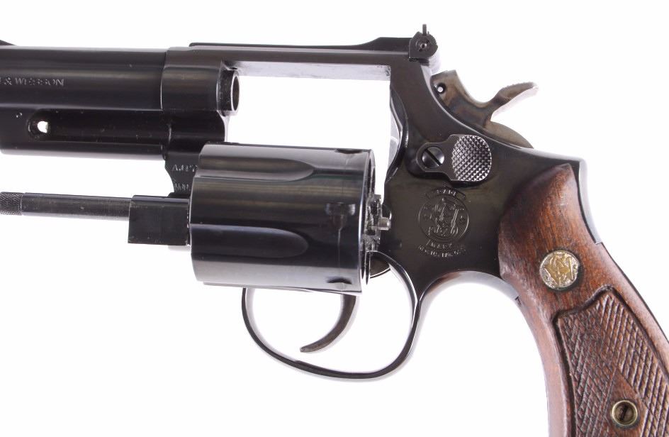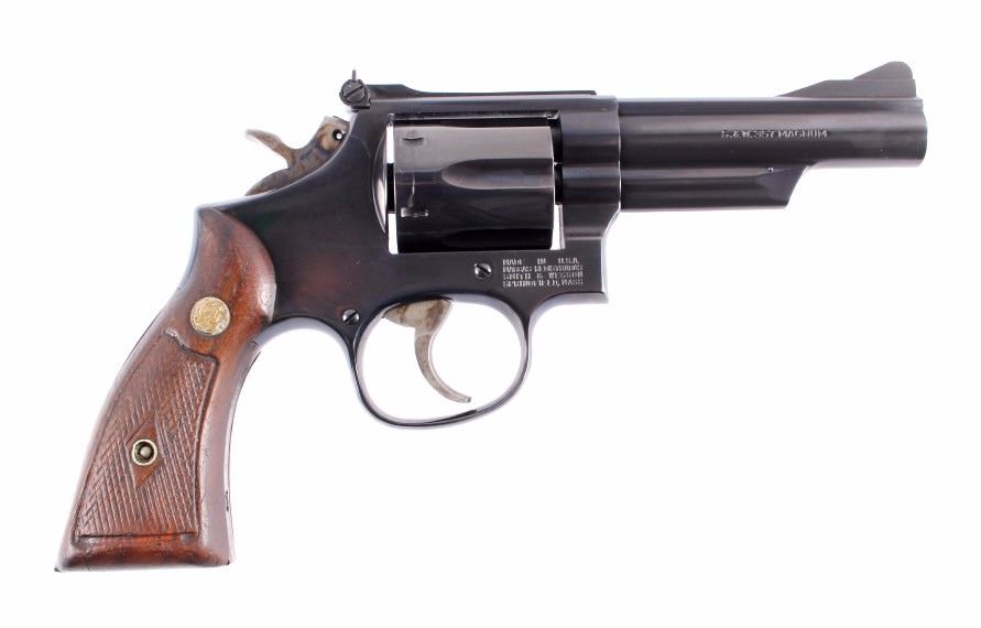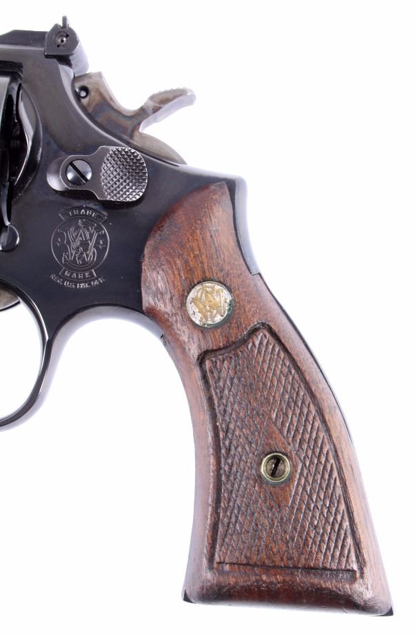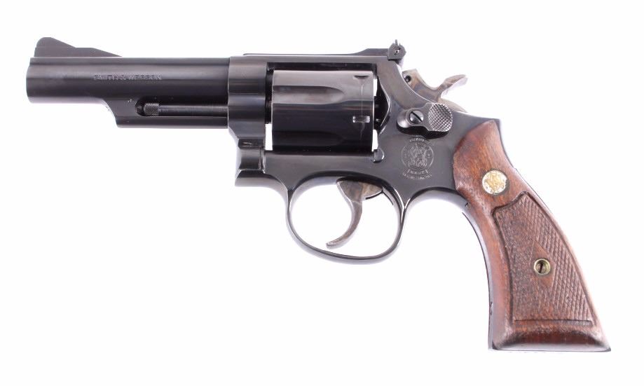 This is a Smith & Wesson Model 19-5 double action revolver chambered in the .357 Magnum caliber. The revolver shows a blued frame, cylinder and 4" barrel with solid walnut hardwood checkered grips. The barrel is marked "Smith & Wesson" and "S.&W. 357 Magnum". The frame is marked with the Smith & Wesson emblem just below the hammer. The inside of the yolk is marked "Mod. 19-5". The revolver shows good condition. It measures 9.5" with a 4" barrel. Serial number is AJP7420. This is a modern manufactured handgun and requires NICS background check or FFL transfer.