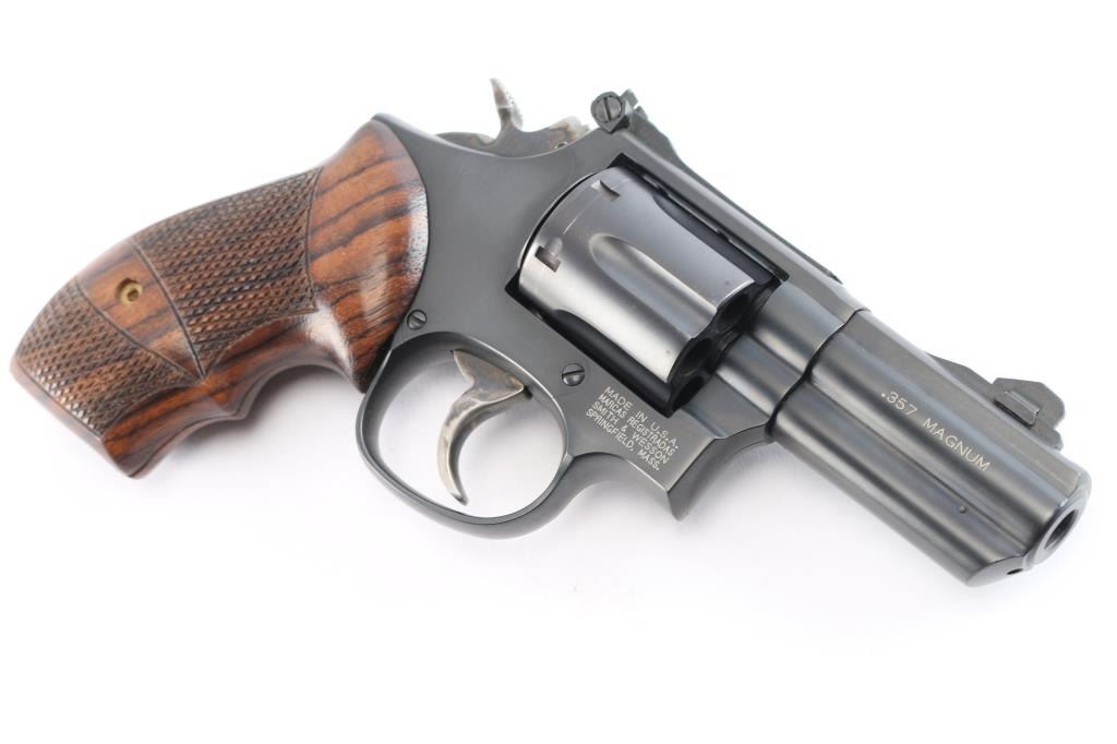 "The .357 Combat Magnum," an American made double action revolver chambered for .357 Magnum, and manufactured in the mid-1990's. This is a Performance Center Model 19-7 "K-Comp" with a 'SDA' serial prefix, and less than 1500 were produced. Revolver features a matte blued finish, 3" barrel with Power Point venting, shrouded guide rod, full-length underlug, ramped and dovetailed tritium front sight (has dimmed), micrometer adjustable notched rear sight, color-case smooth curved combat trigger, color-case hammer, checkered hammer spur, six-shot fluted cylinder with counterbores, checkered cylinder release, ten-groove serrated grip straps, three-screw round butt target 'K' frame, and checkered finger grooved hardwood grips. Revolver retains approximately 99% of its original blued finish with only superficial handling marks, and a light drag line on the cylinder. Metal displays no rust, or deformation. Bore is bright with strong rifling, and the cylinder chambers are also excellent. Although, the pistol needs to be cleaned. The action is smooth and crisp with a tight lock-up, and the grips are excellent. This pistol includes original factory blue plastic hard case with paperwork.