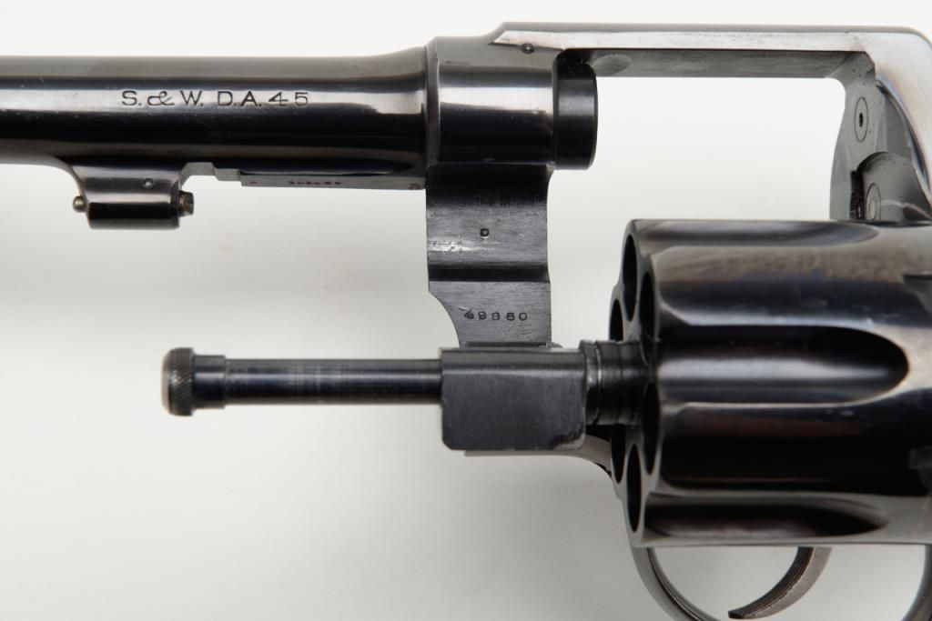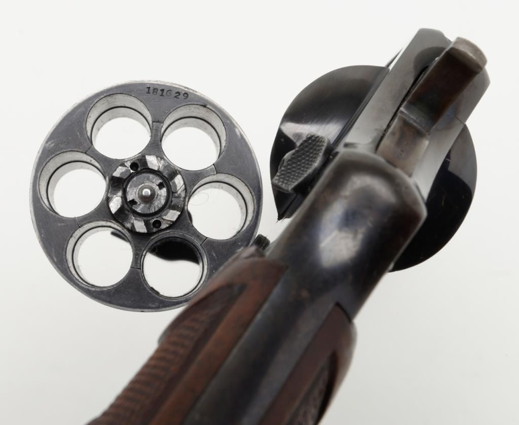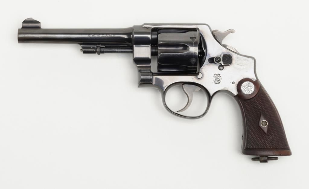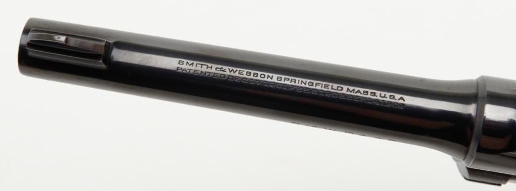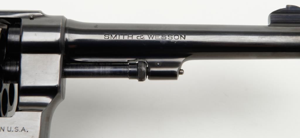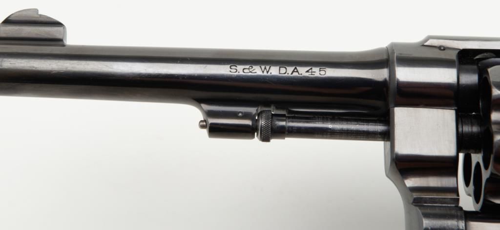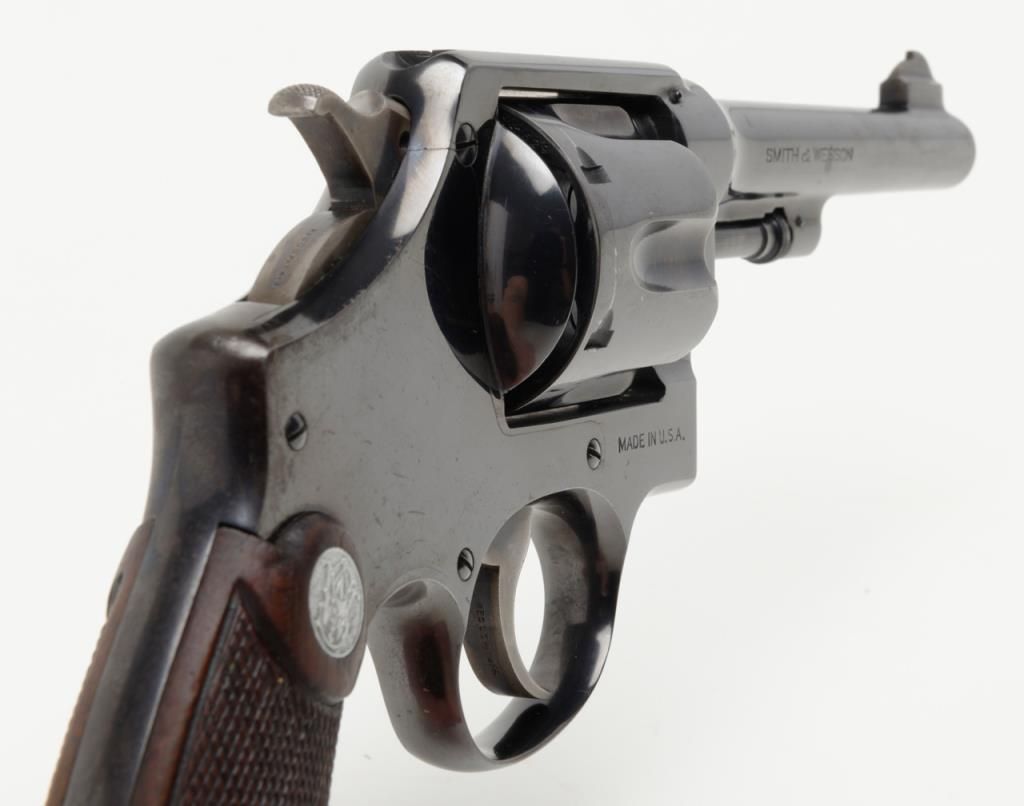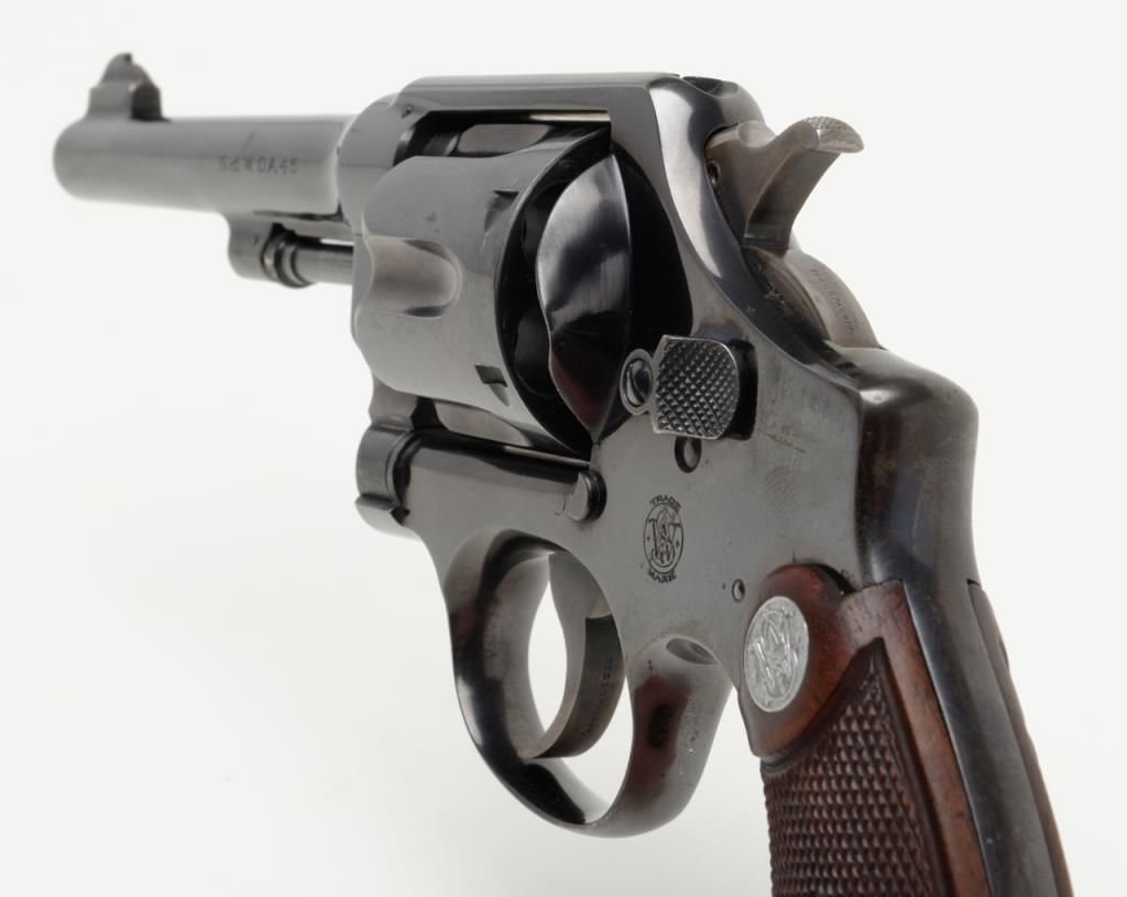 Smith & Wesson Model 1917 Commercial DA revolver, .45 cal., 5-1/2” barrel, blue finish, checkered wood medallion grips, lanyard ring, #181629 in overall fine condition showing the majority of its original high polish blue, fine bore, crispaction, sharp markings, fine wood grips, majority of original case colors on hammer and trigger; front sight has been notched long ago. (C&R). Est.: $900-$1,800