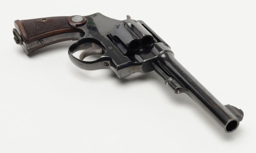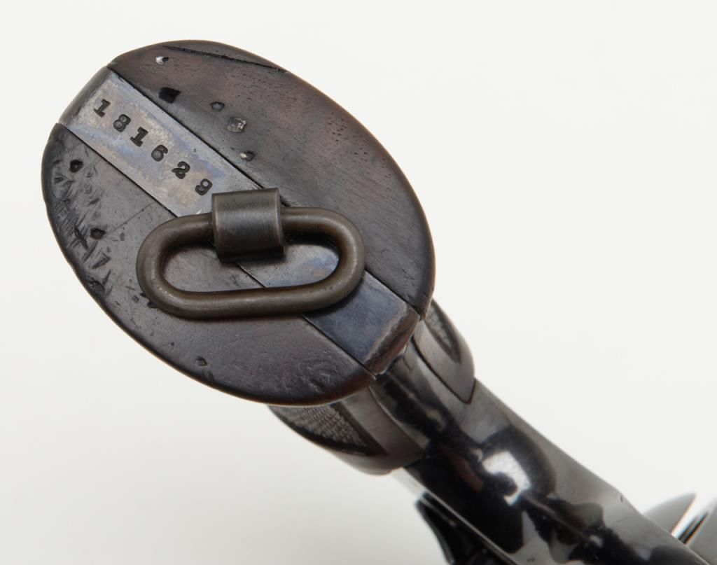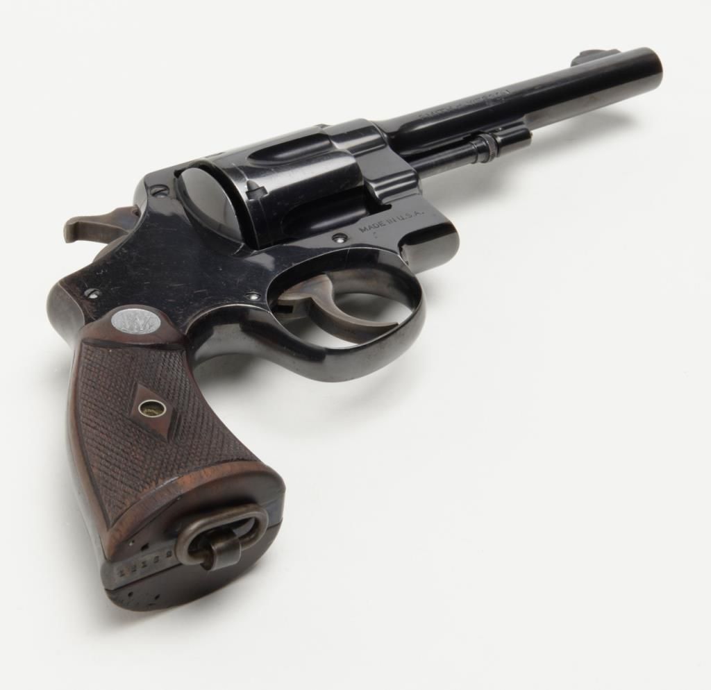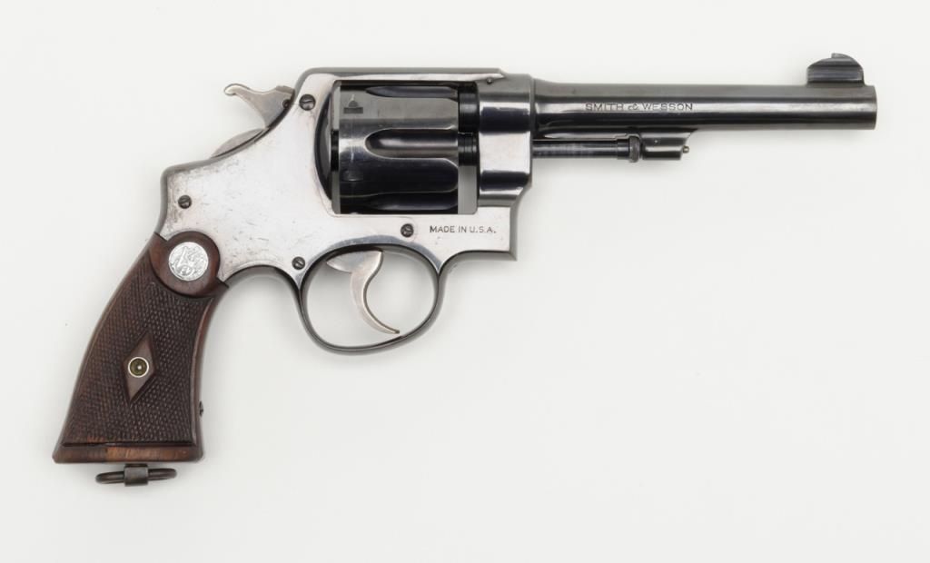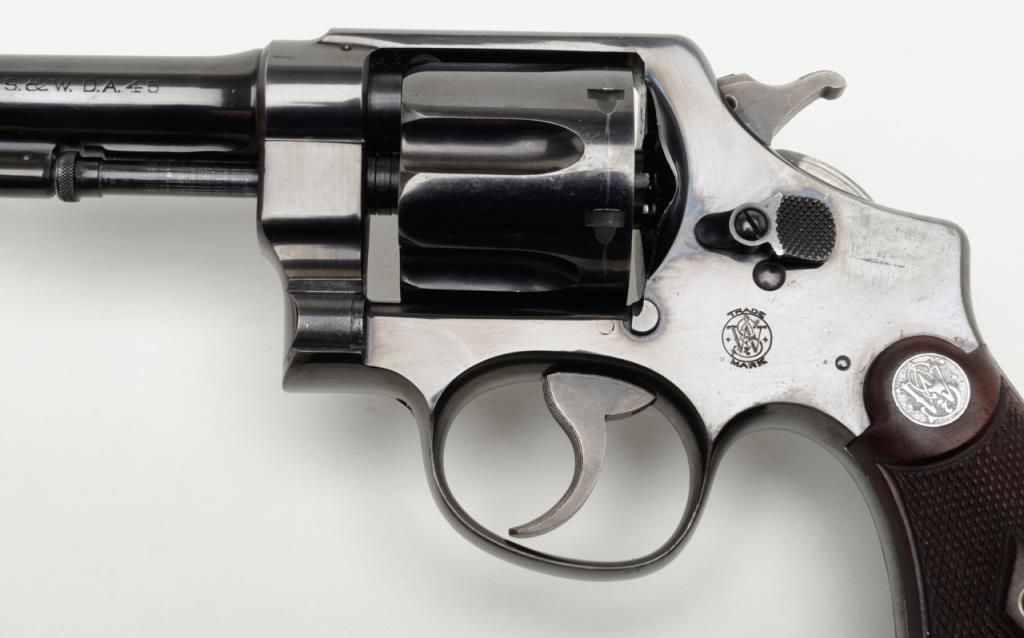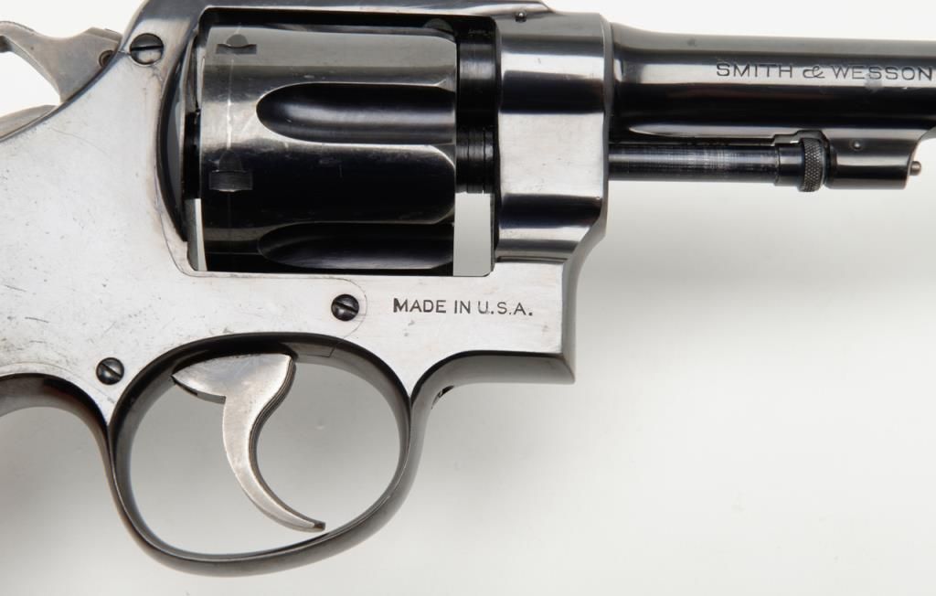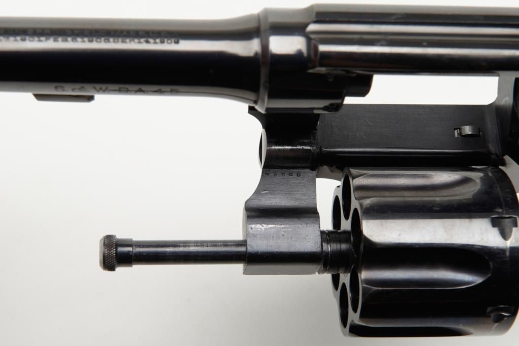 Smith & Wesson Model 1917 Commercial DA revolver, .45 cal., 5-1/2” barrel, blue finish, checkered wood medallion grips, lanyard ring, #181629 in overall fine condition showing the majority of its original high polish blue, fine bore, crispaction, sharp markings, fine wood grips, majority of original case colors on hammer and trigger; front sight has been notched long ago. (C&R). Est.: $900-$1,800