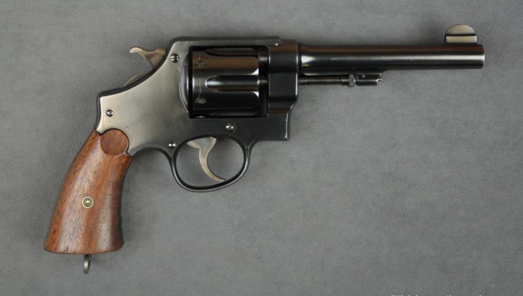 Smith & Wesson Model 1917 U.S. Property DA revolver, .45 cal., 5-1/2” barrel, blue finish, smooth wood grips, #145. This gun is in overall excellent condition showing approx. 98% original finish, fine bore,action, markings and grips; lanyard ring present. Est.: $400-$800.