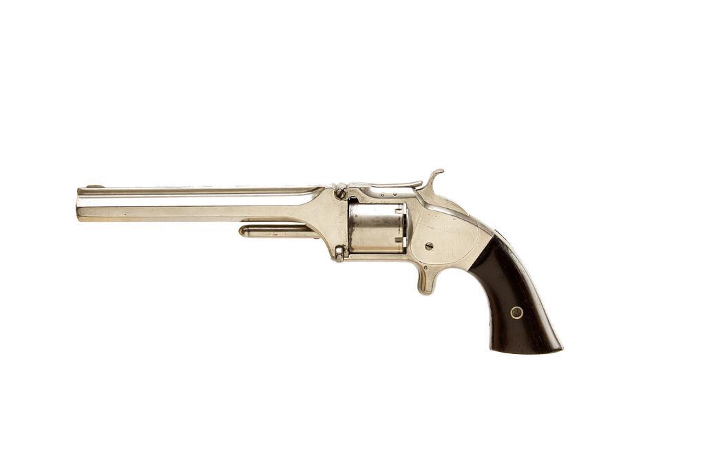 Smith & Wesson Model 2 Cal .32RF SN:8947 Early 2 pin frame shows Civil War production period for this tip up 6 shot revolver with patent dates on the cylinder. Renickeled finish, smooth rose wood grips, 6" barrel with fixed sights, good bore and action.