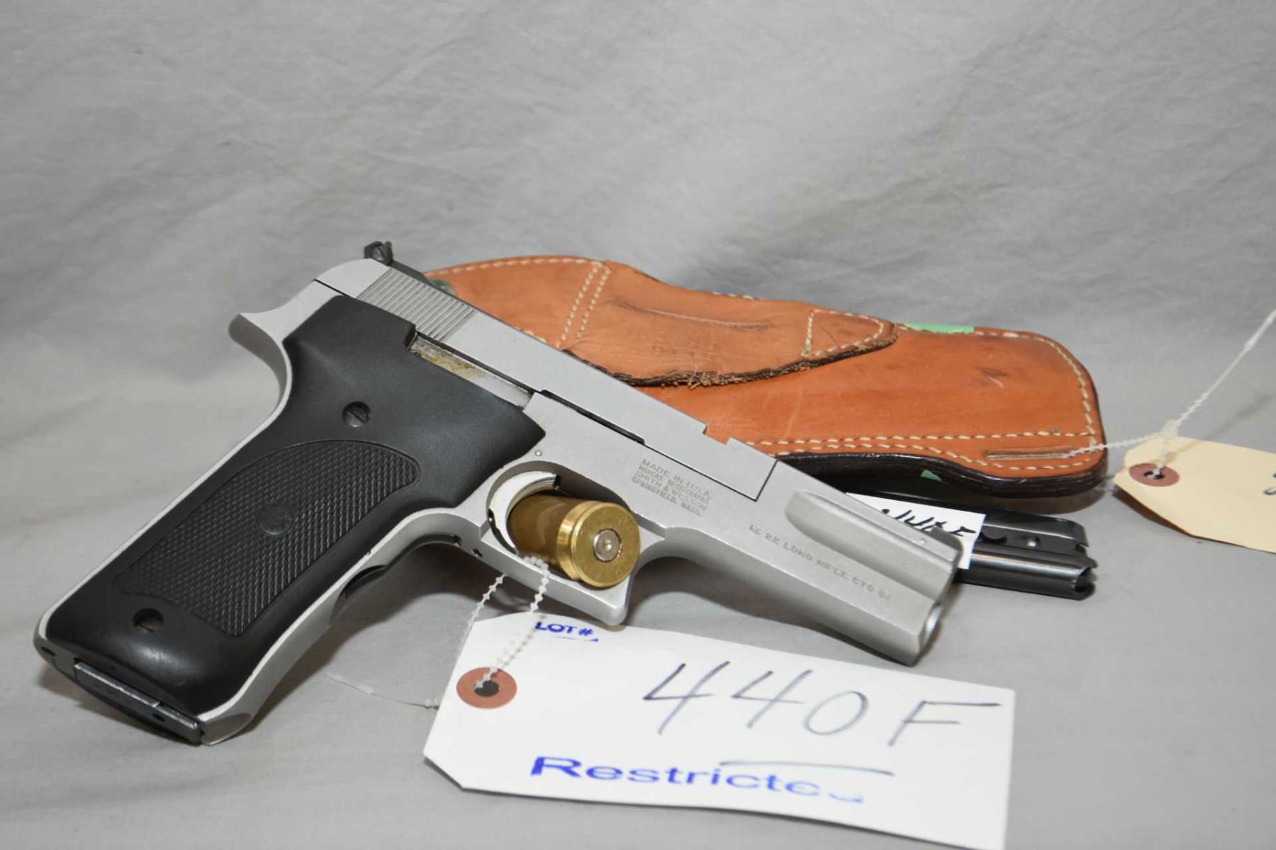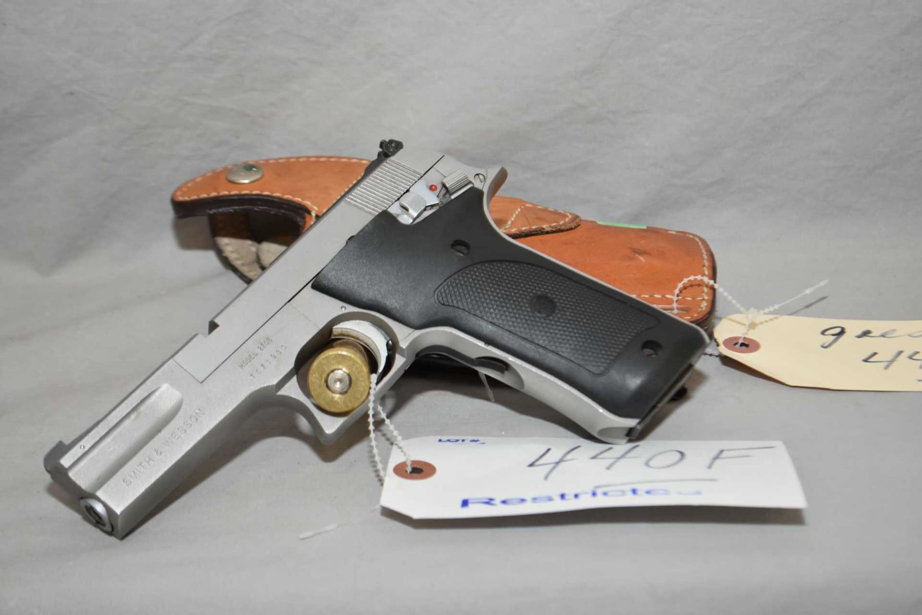 Smith & Wesson Model 2206 .22 LR Cal 10 Shot Semi Auto Pistol w/ 114 mm bbl [ flat stainless finish, barrel sights, missing wedge out of slide, black checkered Smith & Wesson grips, with Hunter leather holster, some slight marks, part above right grip , c/w extra mag ] Ser # TEZ 1930 Restricted Handgun Cert # 5147594 FRT # 21883 - 1