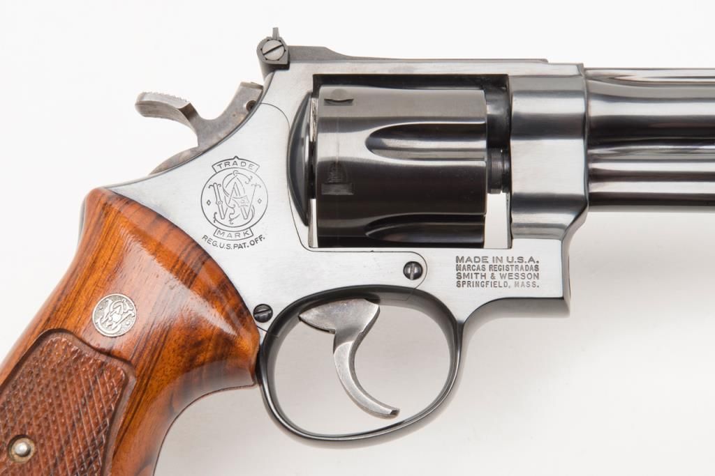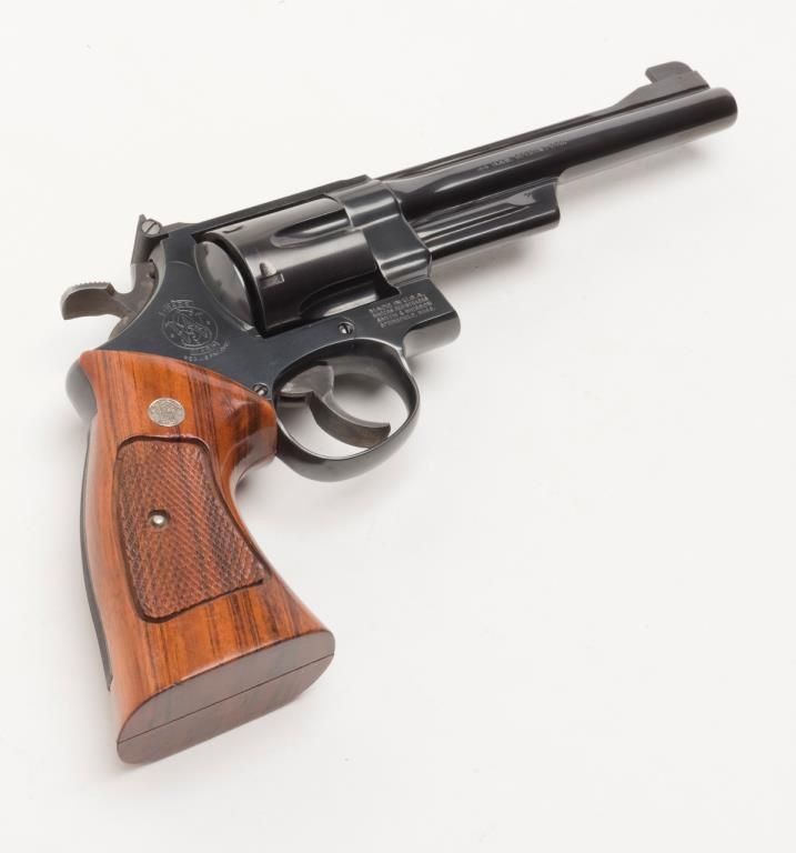 Smith & Wesson Model 24-3 DA revolver, .44 Special cal., 6-1/2” barrel, blue finish, target hammer and trigger, checkered wood medallion combat grips, #ABZ7123 in overall fine condition showing the majority of its original finish, fine bore,crisp action, sharp markings and fine grips. Est.: $400-$800.