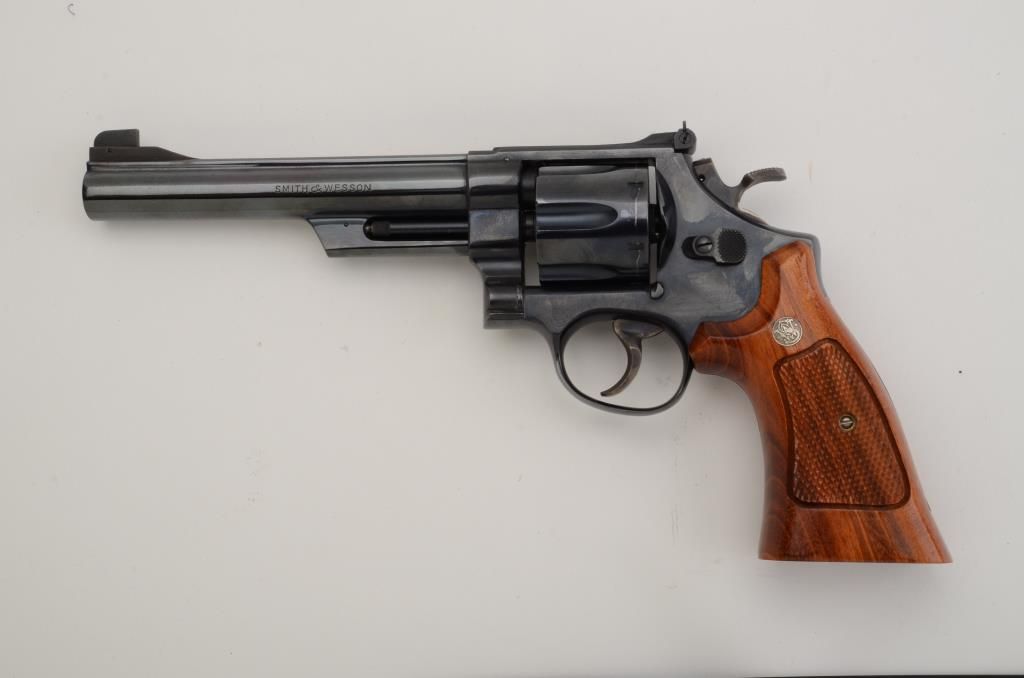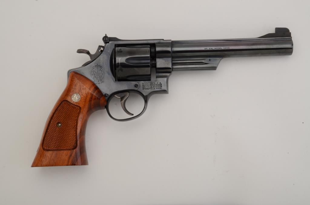 Smith & Wesson Model 25-2 DA revolver, .45 cal. (Model 1955), 6-1/2” pinned barrel, blue finish, target hammer and trigger, checkered wood medallion combat grips, #S279714. This gun is in overall like new condition showinglittle use or handling. Est.: $600-$1,200.