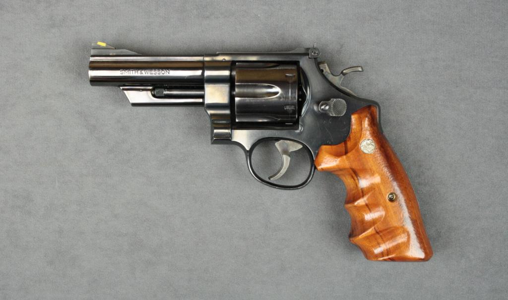 Smith & Wesson Model 25-5 DA revolver, .45  Colt cal., 4” barrel, blue finish,  S&W  medallion finger groove wood grips, #N847075.  This gun is in overall fine condition  showing approx. 96% original finish with only loss to muzzle wear, fine bore, crisp  action, sharp markings, adjustable rear  sight, yellow insert front sight, target  hammer and trigger, excellent grips.  Est.:   $400-$800.
