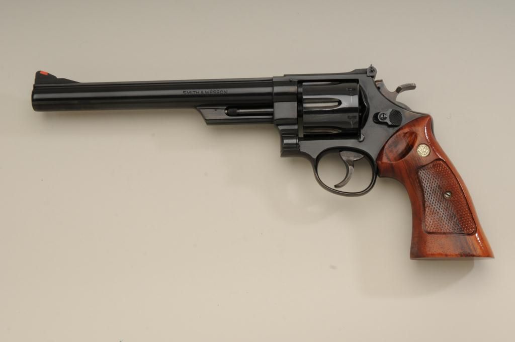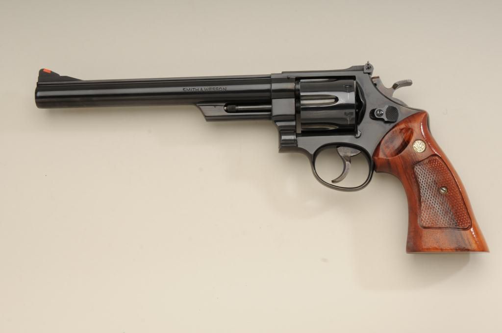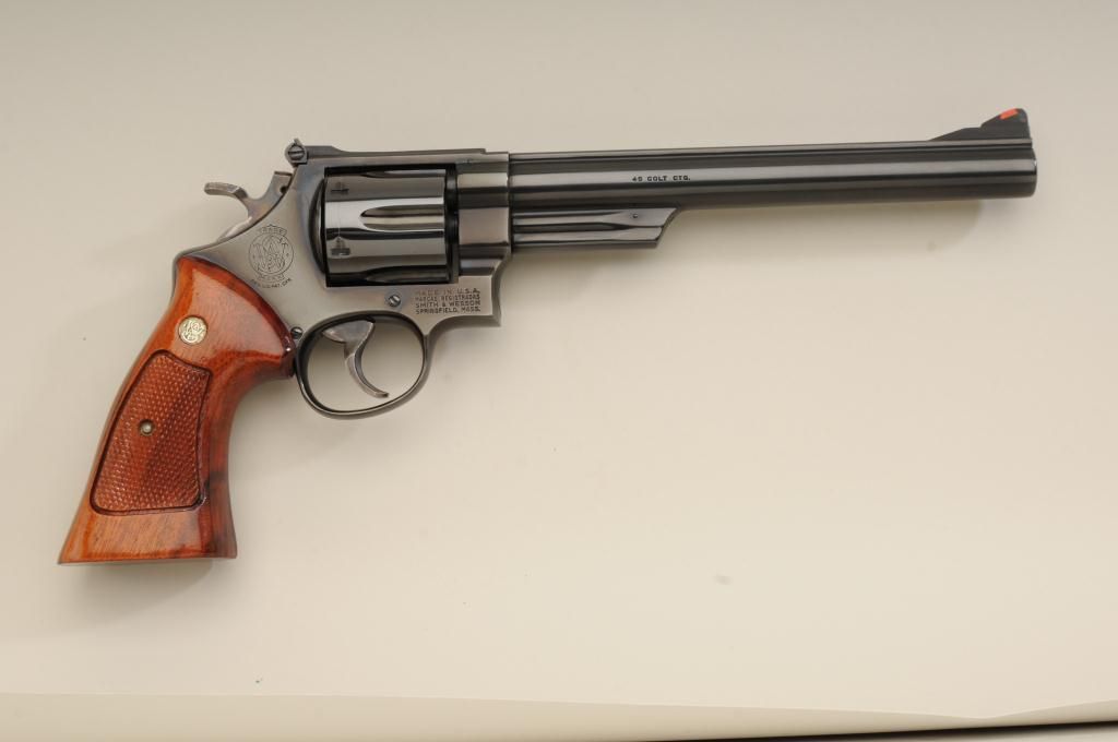 Smith & Wesson Model 25-5 DA revolver, .45 Colt cal., 8-3/8” barrel, blue finish, checkered combat wood medallion grips, target hammer and trigger, #N660200 in factory wood presentation box with cleaning kit andinstructions. This gun is in overall excellent condition showing approx. 99%+ original finish, fine bore, action, markings and grips; case is overall very good to fine. Est.: $400-$800.