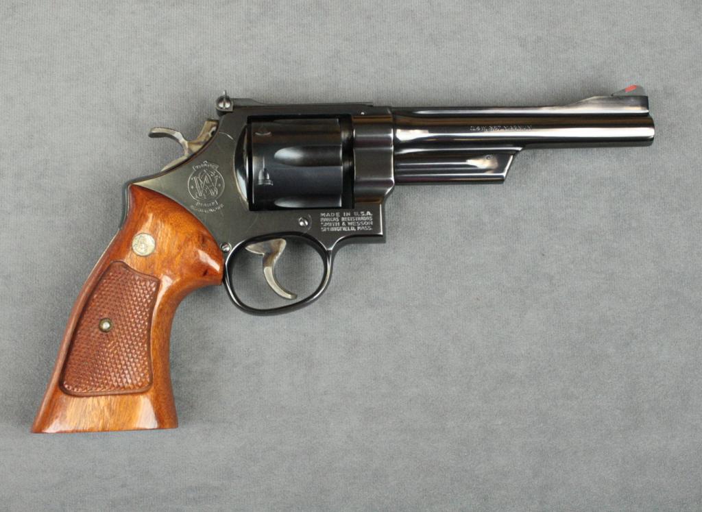 Smith & Wesson Model 27-2 DA revolver, .357 Magnum cal., 6” barrel, black finish, checkered medallion wood combat grips, #N393089. This gun is in overall excellent condition showing approx. 99% originalfinish, fine bore, crisp action, sharp markings, target hammer and trigger, excellent grips, pinned barrel; accompanied by a Smith & Wesson wood presentation case with cleaning tools, blue factory cardboardbox and shipping box. Est.: $350-$700.