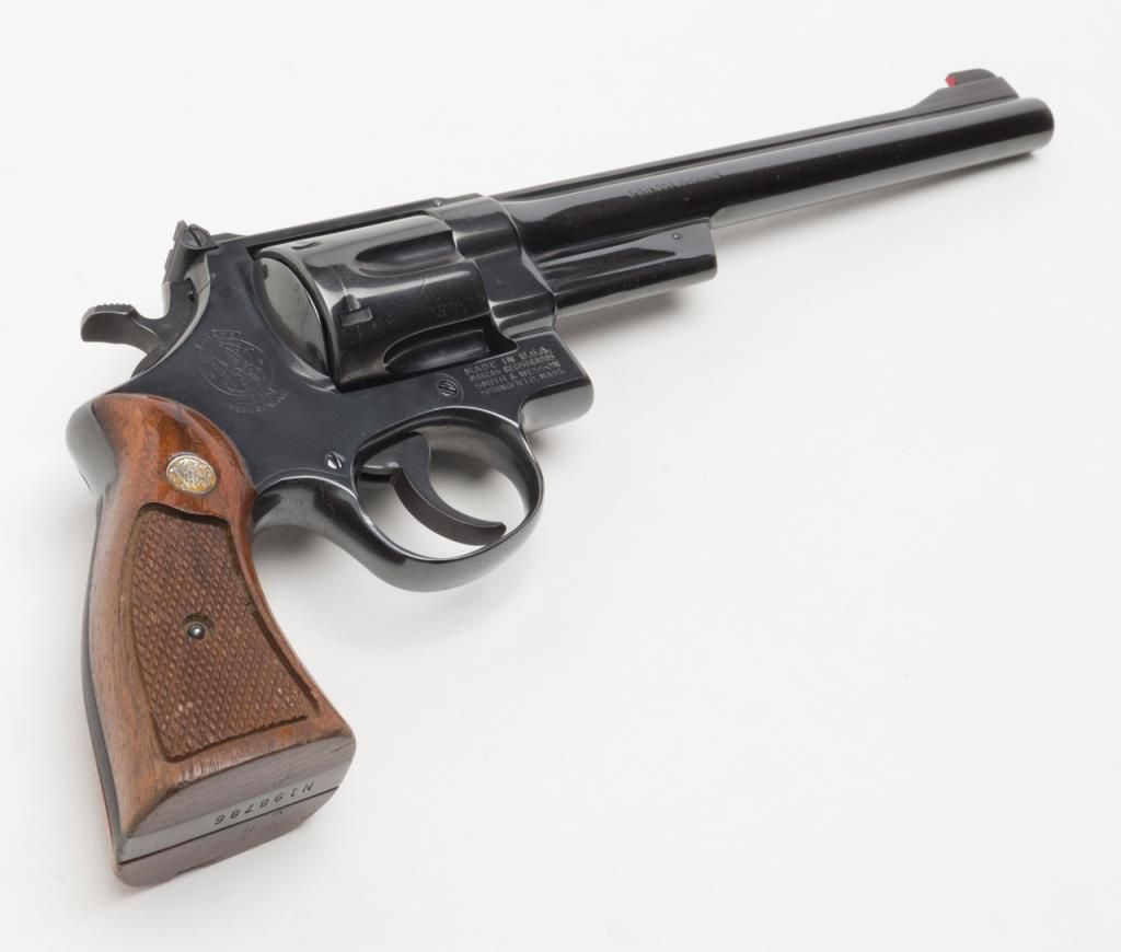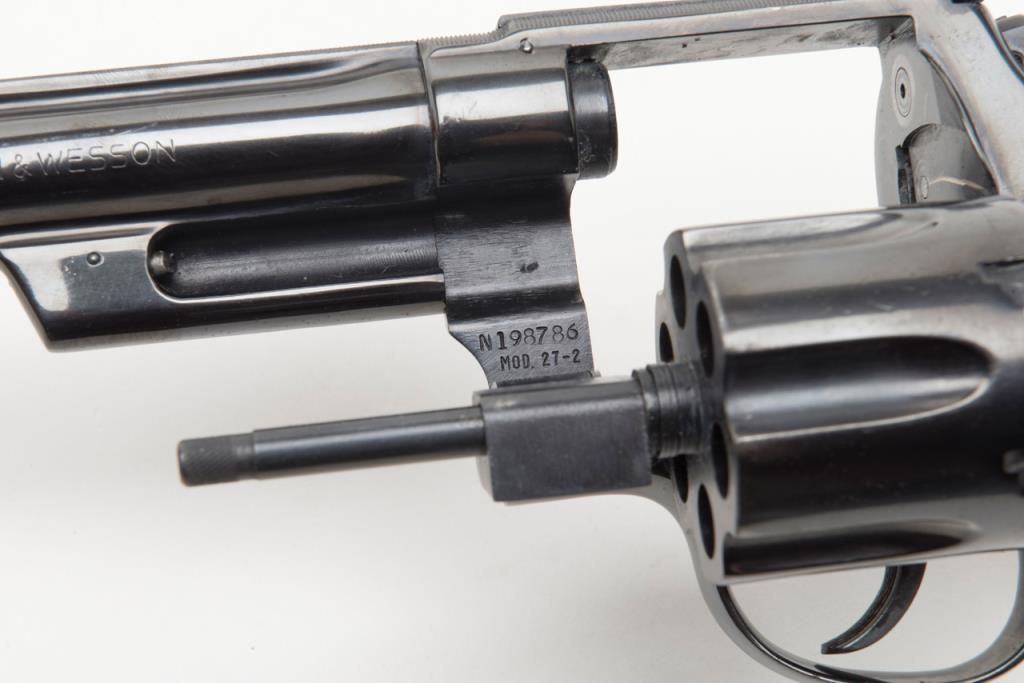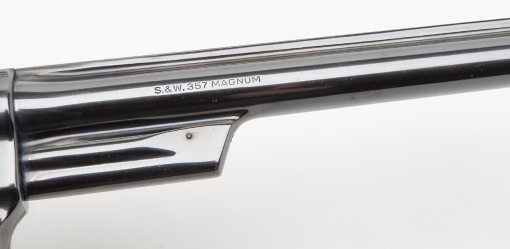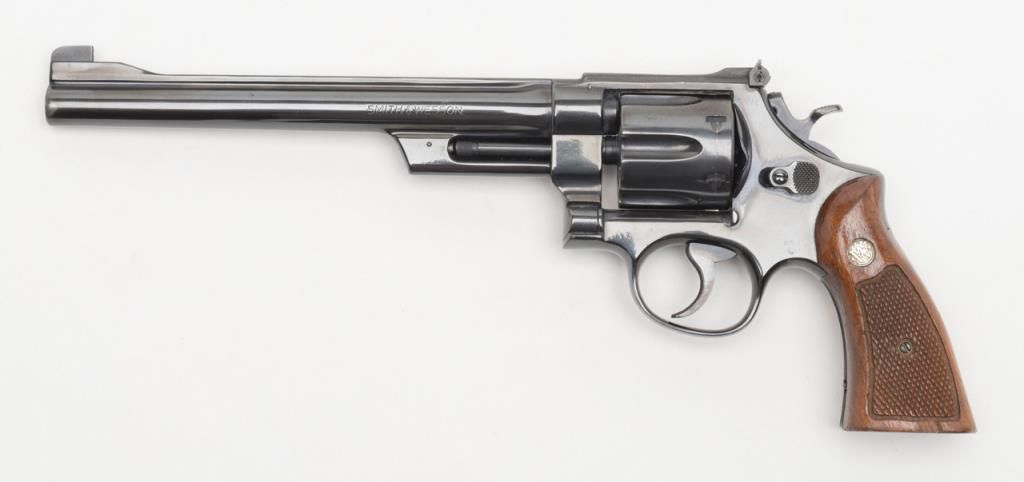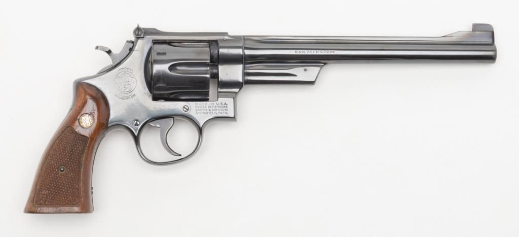 Smith & Wesson Model 27-2 DA revolver, .357 Magnum cal., 8-3/8” barrel with matted top of barrel and frame, quality older re-blue, checkered wood medallion grips, #N198786 in overall very good + condition as re-finished showing the majority ofthat finish with some muzzle and high point wear, fine bore, crisp action, very good markings and grips with an old chip out of the bottom edge of the left grip. (Modern/No Sale to Calif. Resident). Est.: $600-$1,200.