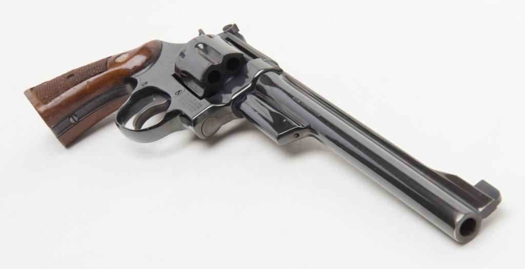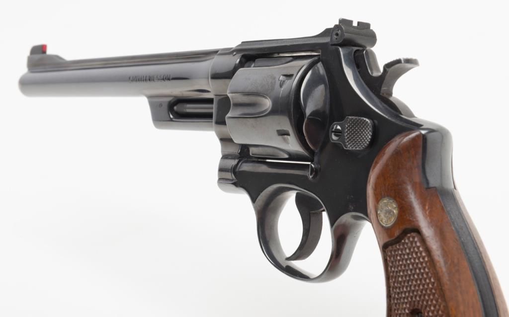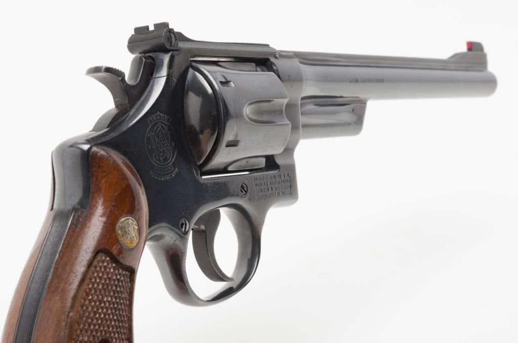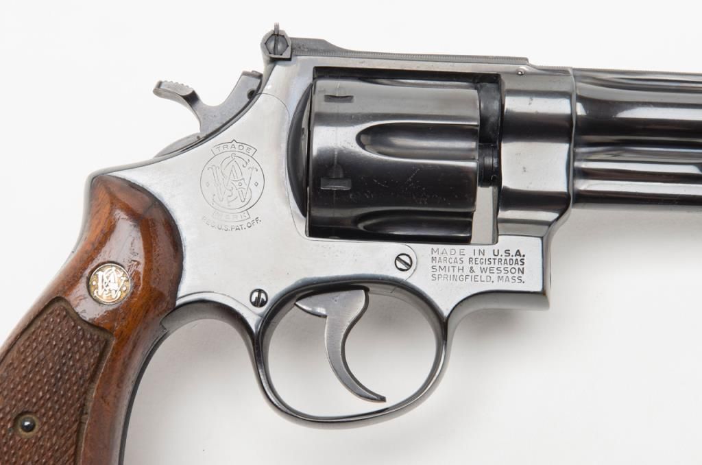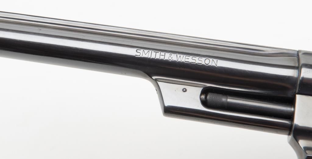 Smith & Wesson Model 27-2 DA revolver, .357 Magnum cal., 8-3/8” barrel with matted top of barrel and frame, quality older re-blue, checkered wood medallion grips, #N198786 in overall very good + condition as re-finished showing the majority ofthat finish with some muzzle and high point wear, fine bore, crisp action, very good markings and grips with an old chip out of the bottom edge of the left grip. (Modern/No Sale to Calif. Resident). Est.: $600-$1,200.