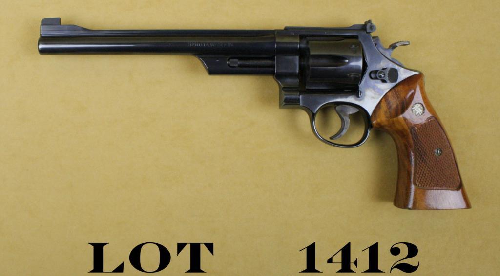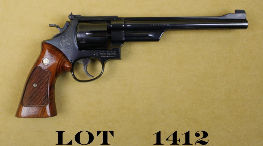 Smith & Wesson Model 27-2 DA revolver, .357 magnum cal., 8-3/8” barrel, blue finish, combat checkered medallion wood grips, #N757730. This gun is in overall excellent condition showing approx. 99% originalfinish, excellent bore, action, markings and grips; target hammer and trigger. Est.: $350-$700.