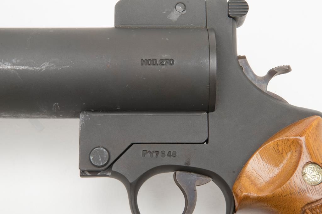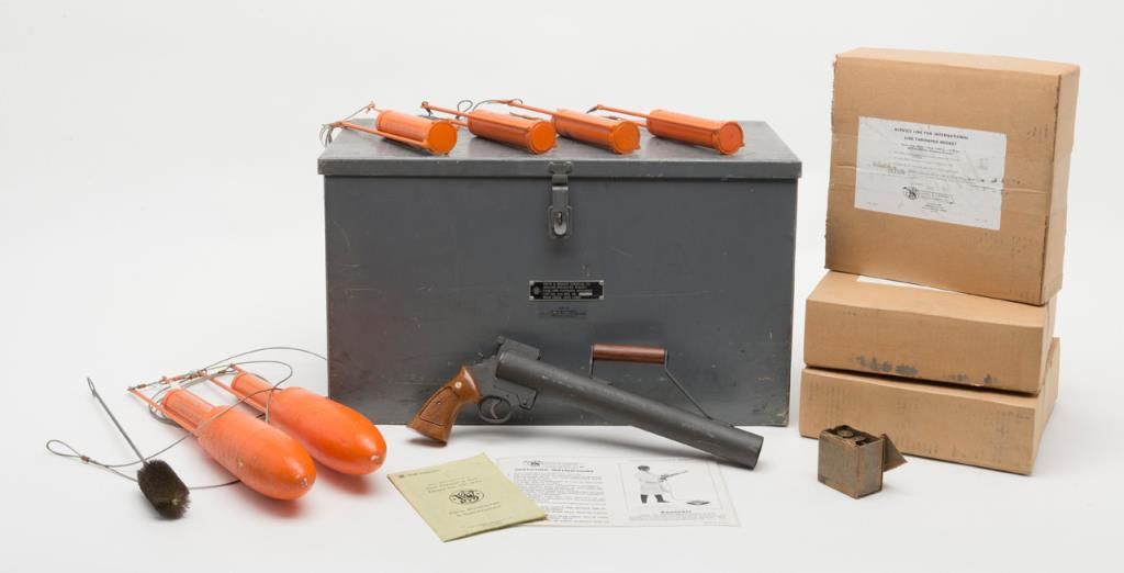 Smith & Wesson Model 270 Line Throwing Pyrotechnic Gun #PY7648 with factory metal case approx. 16” in height, 27” wide and 14” deep. The gun is in overall very good condition as is the case which contains three factory un-opened cardboard boxesthat each contain a line throwing rocket; also in the metal case are 3 additional rockets, a gun cleaning brush, two operational instruction charts and a Parts, Accessories and Specifications Manual; we have sold the Pyrotechnic Guns beforebut not a complete set like this! Est.: $800-$1,600.